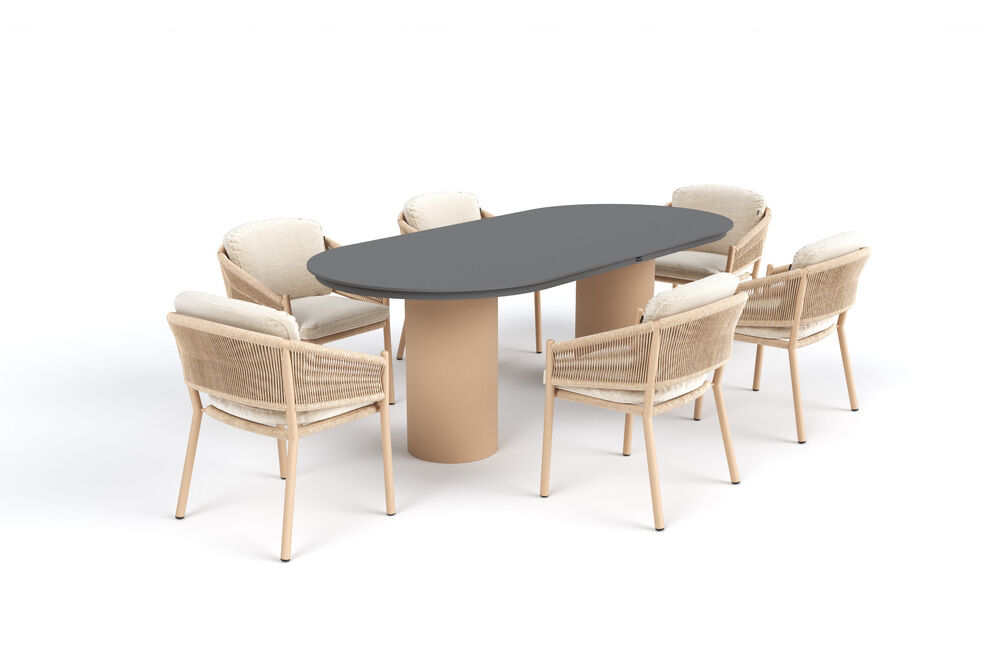 Herzstück der Garten-Essgruppe ist der großzügige Esstisch mit ovaler Keramik-Tischplatte. Mit einem Maß von ca. 220 x 100 cm bietet die Tischfläche komfortabel Platz für bis zu sechs Personen. Die anthrazitfarbene Keramikplatte überzeugt durch ihre kratzfeste und pflegeleichte Oberfläche. Sie ist robust im täglichen Gebrauch und eignet sich ideal für gesellige Abende im Freien. Das stabile Aluminiumgestell in cappuccino wird von zwei markanten Säulenbeinen getragen und sorgt für eine ausgewogene Standfestigkeit. Mit einer Höhe von ca. 75 cm bietet der Tisch angenehme Sitzbedingungen für lange Dinnerabende.