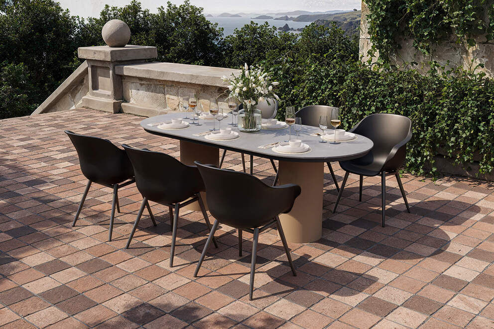 Die ca. 220 x 100 cm große, ovale Keramik-Tischplatte bietet viel Platz für bis zu sechs Personen und sorgt für eine harmonische Sitzanordnung bei gemeinsamen Mahlzeiten im Garten. |