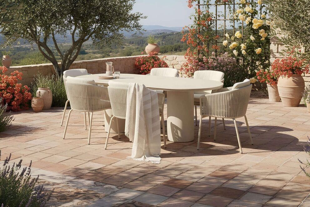 Großzügig für 6 Personen Mit dem Tisch in ca. 220 x 100 cm und sechs Diningsesseln entsteht ein einladender Essplatz für Familie und Gäste – ideal für lange Sommerabende, Brunch oder Grillrunden auf Terrasse und Balkon. |