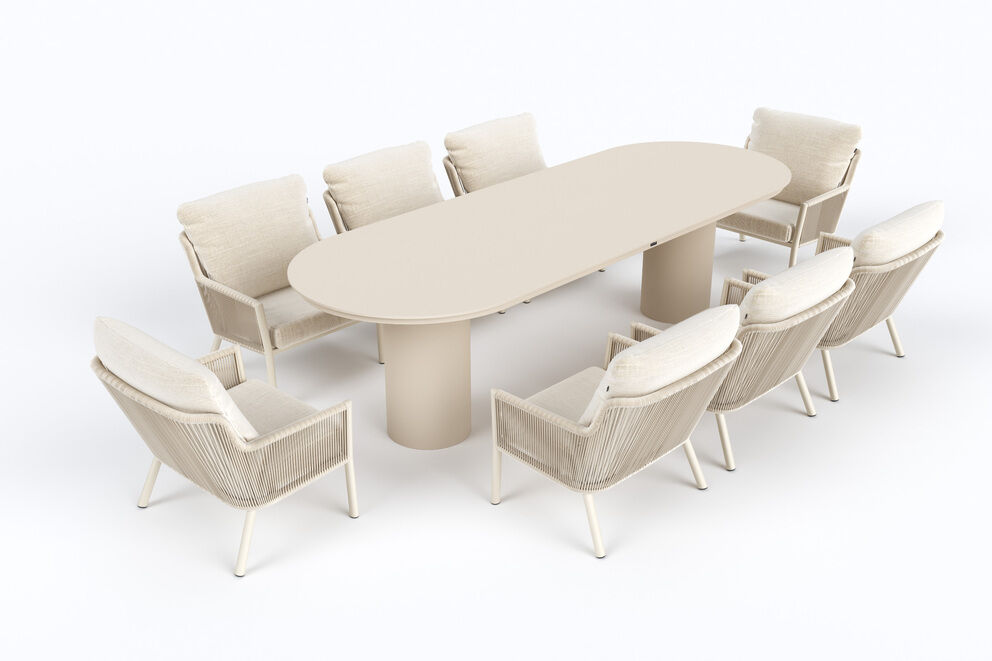 Die acht Low Dining-Sessel ergänzen den Tisch perfekt und greifen die sanfte Farbgebung konsequent auf. Das Rope-Geflecht in Kombination mit einem Aluminiumgestell verleiht den Sesseln eine luftige, moderne Optik und sorgt gleichzeitig für ein angenehmes Sitzgefühl. Jeder Sessel ist mit Sitz- und Rückenkissen ausgestattet, die zusätzlichen Komfort bieten und eine entspannte Sitzposition unterstützen.