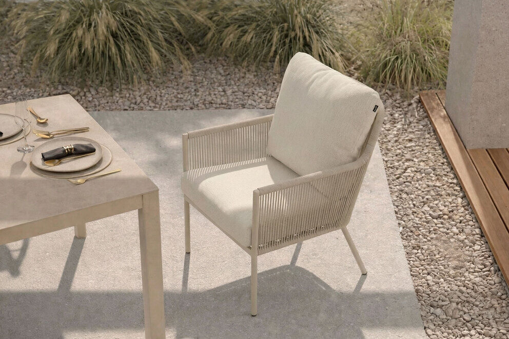 Alle Materialien des Sessels sind auf dauerhafte Nutzung ausgelegt und benötigen nur minimale Pflege. Das pulverbeschichtete Gestell ist korrosionsbeständig, das Rope-Geflecht strapazierfähig, und die Polster lassen sich leicht reinigen. So bleibt der Sessel dauerhaft ein hochwertiger und komfortabler Begleiter im Outdoor-Alltag. |