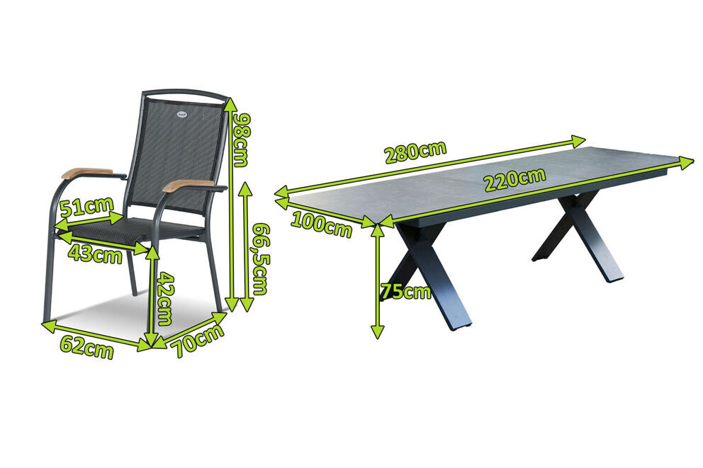 Mit den Stapelsesseln aus der Raffaelo Serie kommt die perfekte Kombination aus Stil und Komfort in den heimischen Garten - denn das Modell besticht nicht nur durch den robusten Aluminiumrahmen und die hochwertigen Armlehnen aus FSC®-Teakholz, sondern auch durch die leicht geschwungene Rückenlehne, die herausragenden Komfort bietet. Mit Maßen von ca. 62 x 70 x 98 cm, einer Sitzhöhe von ca. 42 cm und einer Sitzfläche von ca. 43 x 51 cm passt er perfekt zum Tisch. Die Sessel sind in einem edlen xerix / anthrazit gehalten, lediglich die Armlehnen aus FSC®-zertifiziertem Teak sind farblich hervorgehoben.