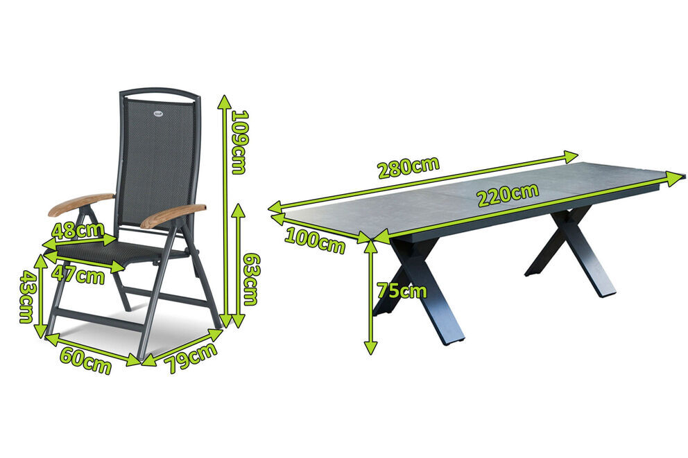 Mit den Klappstühlen aus der Raffaelo Serie kommt die perfekte Kombination aus Stil und Komfort in den heimischen Garten - denn das Modell besticht nicht nur durch den robusten Aluminiumrahmen und die hochwertigen Armlehnen aus FSC®-Teakholz, sondern auch durch die justierbare Rückenlehne, die aufrecht wie zurückgelehnt herausragenden Komfort bietet. Mit Maßen von ca. 79 x 60 x 109 cm, einer Sitzhöhe von ca. 43 cm und einer Sitzfläche von ca. 48 x 47 cm passt er perfekt zum Tisch. Die Sessel sind in einem edlen xerix / anthrazit gehalten, lediglich die Armlehnen aus FSC®-zertifiziertem Teak sind farblich hervorgehoben.