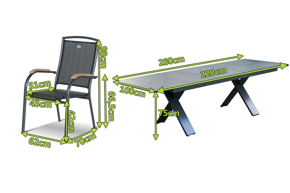 Der Tisch mit dem gekreuzten Gestell ist gefertigt aus pulverbeschichtetem Aluminium in der Farbe Xerix (Anthrazit) und wird optisch perfekt durch die Glaskeramik-Tischplatte, ebenfalls in der Farbe Xerix ergänzt. Die Maße von ca. 220 x 100 x 75 cm sorgen dafür, dass stets ausreichend Ablagefläche zur Verfügung steht. Bei Bedarf kann der Tisch auf eine Länge von ca. 280 cm ausgezogen werden, so finden bequem auch große Runden genügend Platz in Ihrem Garten. Dank der Ausziehfunktion hebt sich dieses Modell von den üblichen Tischen der Xanadu Serie ab - den Ausziehtisch erhalten Sie exklusiv bei uns.