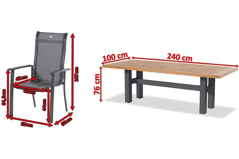 Der Tisch besteht aus einem hochwertigen Aluminiumgestell in der Farbe 'Xerix' (Anthrazit) und einer ca. 4 cm dicken Teakholz-Tischplatte in einem natürlichen Teak-Farbton. Damit hebt sich dieses Modell von den üblichen Tischen aus der Yasmani-Serie ab, denn diese gibt es normalerweise nur mit einer Tischplatte in der Farbe 'Vintage Brown', also mit einer deutlich dunkleren Tischplatte. Das bei diesem Tisch verwendete Teakholz wurde allerdings so behandelt, dass es zu 100% dem FSC-Teakholz Farbton entspricht und damit perfekt zu den im Set inbegriffenen Sesseln aus der 'Alice Comfort'-Serie passt. Mit seiner Größe von ca. 240 x 100 x 77 cm bietet er dabei ausreichend Platz für 8 Personen.