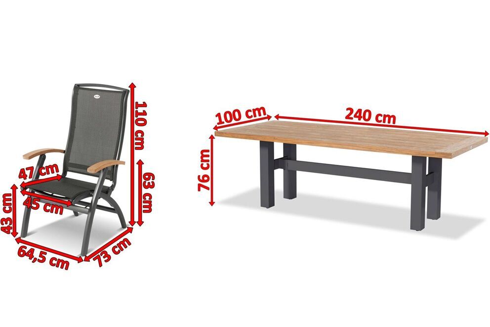 Die verwendeten Materialien sind extrem witterungsbeständig und pflegeleicht, daher können sie auch bei schlechtem Wetter ohne Probleme auf Ihrer Terrasse stehen bleiben. Die Textilenbespannung (70% Polyvinylchlorid, 30% Polyester) in der Farbe Anthrazit ist beständig gegen UV-Strahlung, sodass die Farben lange frisch aussehen. Außerdem trocknet sie nach einem kurzen Schauer sehr schnell. Teakholz und Aluminium sind besonders witterungsbeständig und halten sowohl Frost und Hitze als auch Feuchtigkeit und Regen aus. Teakholz hat aufgrund des hohen Anteils an holzeigenen Ölen einen natürlichen Schutz gegen Pilze und Schädlinge. So beschränkt sich die Pflege Ihrer neuen Gartenmöbel auf ein Minimum und Sie können Ihre Zeit im Garten mit angenehmen Tätigkeiten verbringen.