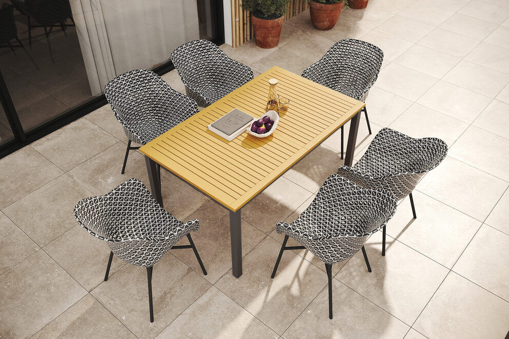 Ergänzt wird der Tisch durch sechs stilvolle Delphine Armlehnensessel, die durch ihre ergonomische Form und das luftige Design sofort ins Auge fallen. Die Sitzschale besteht aus widerstandsfähigem Kunststoffgeflecht in Schwarz-Weiß mit geometrischem Muster und überzeugt nicht nur optisch, sondern auch durch angenehmen Sitzkomfort. Das stabile Aluminiumgestell sorgt für sicheren Halt und rundet das moderne Erscheinungsbild perfekt ab.