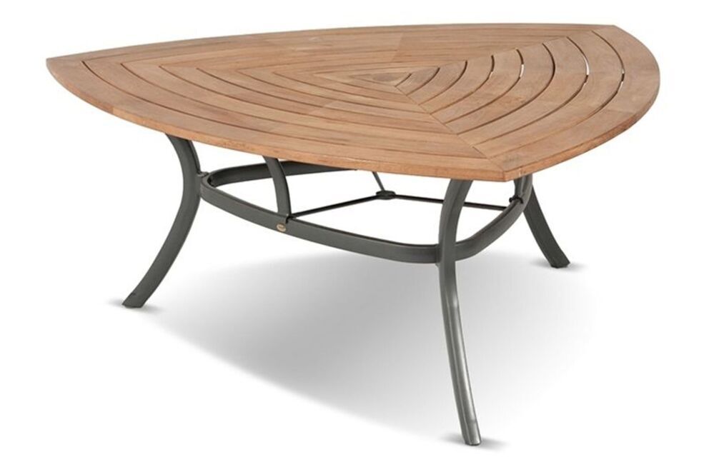 Eine Tischplatte im modernen, dreieckigen Design aus Teakholz in einem natürlichen Braunton aus robusten Teakholz in Kombination mit einer dunkelgrauen Aluminiumbasis, die durch ihre 3 Tischbeine, die ideale Ergänzung zu dieser besonderen Tischplatte ist - der Hersteller Hartman bringt mit diesem Produkt einmal mehr einen besonders schicken Tisch in den heimischen Garten. Die hochwertige Materialwahl robusten Teakholz aus kontrollierter Fällung und robusten, pulverbeschichtetem Aluminium sorgt nicht nur für eine hochwertige Optik, sondern auch für hohe Stabilität und Langlebigkeit.