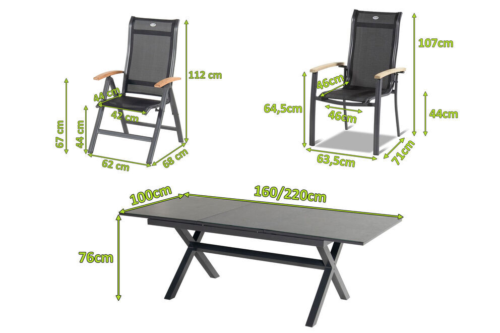 Das gekreuzte Gestell ist gefertigt aus pulverbeschichtetem Aluminium in der Farbe Xerix (Anthrazit) und wird optisch perfekt durch die Glaskeramik-Tischplatte, ebenfalls in der Farbe Xerix ergänzt. Die Maße von ca. 160 x 100 x 75 cm sorgen dafür, dass stets ausreichend Ablagefläche zur Verfügung steht. Bei Bedarf kann der Tisch auf eine Länge von ca. 220 cm ausgezogen werden, so finden bequem auch große Runden genügend Platz in Ihrem Garten. Dank der Ausziehfunktion hebt sich dieses Modell von den üblichen Tischen der Xanadu Serie ab - den Ausziehtisch erhalten Sie exklusiv bei uns.Die verwendeten Materialien sind extrem witterungsbeständig und pflegeleicht, weshalb der Tisch auch bei schlechtem Wetter ohne Probleme auf Ihrer Terrasse stehen bleiben kann. Außerdem ist das Aluminium ziemlich unempfindlich und hält spielend Kälte und Frost stand. Die Tischplatte aus dem Glas-Keramik-Gemisch ist stoß-, schlag- und schnittbeständig und somit ein idealer Begleiter im Familienalltag. Die Trägerplatte ist eine Platte aus Glas, auf die eine dünne Keramikschicht aufgetragen wird.Die Sessel aus der Alice-Serie von Hartman überzeugen durch die qualitative Verarbeitung und die Verwendung ausgesuchter Materialien. Die Armlehnen aus robusten Teakholz erzeugen eine unverwechselbare Optik und machen die Stühle zu einem einzigartigen Möbelstück. Das Gestell aus robusten Aluminium sorgt für ein geringes Eigengewicht von ca. 4,3 kg den Klappstühlen, sowie 5,3 kg bei einer hohen Stabilität, sodass die Sessel mit bis zu 130 kg belastbar sind. Um Ihren Terassenboden vor Kratzern und Macken zu schützen, verfügen die Füße über praktische Bodenschoner. Dank der vorteilhaften Stoffzusammensetzung der 4x4 Textilenbespannung aus 70% Polyvinylchlorid und 30% Polyester profitieren Sie von einer langen Haltbarkeit. Das flexible Material trotzt spielend den üblichen Witterungseinflüssen, passt sich optimal Ihrem Körper an und macht die Modelreihe auch ohne Auflage sehr bequem.