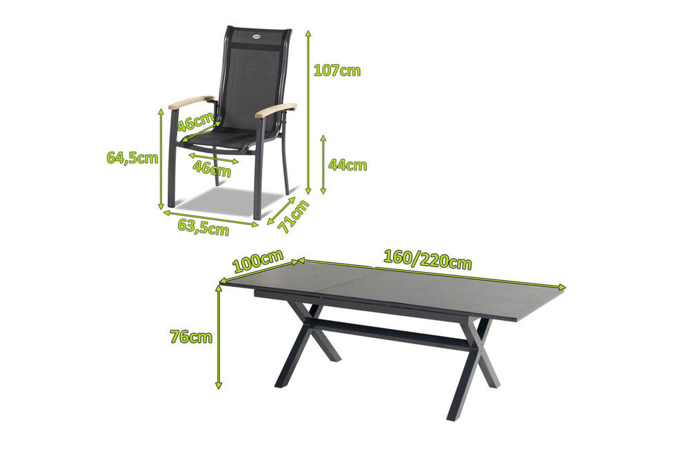 Das gekreuzte Gestell ist gefertigt aus pulverbeschichtetem Aluminium in der Farbe Xerix (Anthrazit) und wird optisch perfekt durch die Glaskeramik-Tischplatte, ebenfalls in der Farbe Xerix ergänzt. Die Maße von ca. 220 x 100 x 75 cm sorgen dafür, dass stets ausreichend Ablagefläche zur Verfügung steht. Bei Bedarf kann der Tisch auf eine Länge von ca. 280 cm ausgezogen werden, so finden bequem auch große Runden genügend Platz in Ihrem Garten. Dank der Ausziehfunktion hebt sich dieses Modell von den üblichen Tischen der Xanadu Serie ab - den Ausziehtisch erhalten Sie exklusiv bei uns. Die verwendeten Materialien sind extrem witterungsbeständig und pflegeleicht, weshalb der Tisch auch bei schlechtem Wetter ohne Probleme auf Ihrer Terrasse stehen bleiben kann. Außerdem ist das Aluminium ziemlich unempfindlich und hält spielend Kälte und Frost stand. Die Tischplatte aus dem Glas-Keramik-Gemisch ist stoß-, schlag- und schnittbeständig und somit ein idealer Begleiter im Familienalltag. Die Trägerplatte ist eine Platte aus Glas, auf die eine dünne Keramikschicht aufgetragen wird. Die Sessel von Hartman wissen durch die qualitativ hochwertige Verarbeitung und Stabilität zu überzeugen. Wegen der Armlehnen aus robusten Teakholz entsteht eine unverwechselbare Optik, die die Stühle zu einem echten Hingucker machen. Dank der vorteilhaften Stoffzusammensetzung der schwarzen 4x4 Textilenbespannung aus 70% Polyvinylchlorid und 30% Polyester profitieren Sie von einer langen Haltbarkeit. Sie werden gar nicht mehr aufstehen wollen, denn das witterungsbeständige Material ist durch seine Flexibilität auch ohne Auflagen sehr bequem. Das Gestell aus robusten Aluminium sorgt für ein geringes Eigengewicht von nur ca. 5,3 kg, sodass sich die Stühle kinderleicht verschieben oder an die gewünschte Position tragen lassen. Trotz des leichten Gewichts sind die Sessel äußerst stabil und können mit bis zu 130 kg belastet werden. Um Ihren Terrassenboden beim Verschieben zu schützen, verfügen die Füße über praktische Bodenschoner. Ob Sie beim Essen ganz aufrecht sitzen möchten oder sich in der Sonne zurücklehnen wollen um zu entspannen, Sie finden immer die richtige Sitzposition. Ebenso schnell und unkompliziert können Sie die Stühle zusammenklappen und platzsparend verstauen.