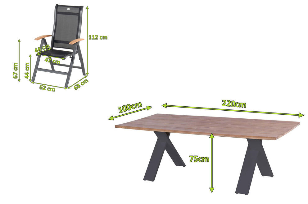 Der Tisch mit dem gekreuzten Gestell ist gefertigt aus pulverbeschichtetem Aluminium in der Farbe Xerix (Anthrazit) und wird optisch perfekt durch die Tischplatte aus SVLK-zertifiziertem Teakholz ergänzt. Die Maße von ca. 220 x 100 x 75 cm sorgen dafür, dass stets ausreichend Ablagefläche zur Verfügung steht und bequem 8 Personen genügend Platz finden.