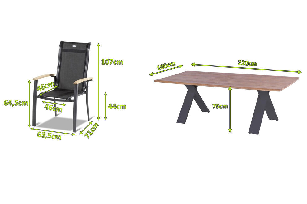 Der Tisch mit dem gekreuzten Gestell ist gefertigt aus pulverbeschichtetem Aluminium in der Farbe Xerix (Anthrazit) und wird optisch perfekt durch die Tischplatte aus SVLK-zertifiziertem Teakholz ergänzt. Die Maße von ca. 220 x 100 x 75 cm sorgen dafür, dass stets ausreichend Ablagefläche zur Verfügung steht und bequem 8 Personen genügend Platz finden. Mit den Stapelsesseln aus der Alice Serie kommt die perfekte Kombination aus Stil und Komfort in den heimischen Garten - denn das Modell besticht nicht nur durch den robusten Aluminiumrahmen und die hochwertigen Armlehnen aus FSC®-Teakholz, sondern auch durch die leicht geschwungene Rückenlehne, die herausragenden Komfort bietet. Mit Maßen von ca. 71 x 63,5 x 107 cm, einer Sitzhöhe von ca. 44 cm und einer Sitzfläche von ca. 46 x 46 cm passt er perfekt zum Tisch. Die Sessel sind in einem edlen xerix / schwarz gehalten, lediglich die Armlehnen aus FSC®-zertifiziertem Teak sind farblich hervorgehoben. Die verwendeten Materialien sind extrem witterungsbeständig und pflegeleicht, daher können die Möbel auch bei schlechtem Wetter ohne Probleme auf Ihrer Terrasse stehen bleiben. Teakholz hat aufgrund des hohen Anteils an holzeigenen Ölen einen natürlichen Schutz gegen Pilze und Schädlinge. So beschränkt sich die Pflege Ihrer neuen Möbel auf ein Minimum und Sie können Ihre Zeit im Garten mit angenehmen Tätigkeiten verbringen. Die 4x4 Textilenbespannung (70% Polyvinylchlorid, 30% Polyester) der Sessel ist beständig gegen UV-Strahlung, sodass die Farben lange frisch aussehen. Außerdem trocknet sie nach einem kurzen Schauer sehr schnell. Falls die Sessel aber doch mal weggeräumt werden sollen, können sie schnell und einfach gestapelt und platzsparend verstaut werden. Zum Schutz Ihrer Terrasse sind die Sessel und der Tisch mit Fußkappen ausgestattet, welche unschöne Kratzer auf dem Boden vermeiden. Die FSC® bzw. SVLK-Zertifizierung der Möbel garantiert Ihnen, dass das Holz aus verantwortungsvollen Quellen stammt, sodass Sie sich entspannt zurücklehnen und Ihren neuen Gartenstuhl so richtig genießen können.