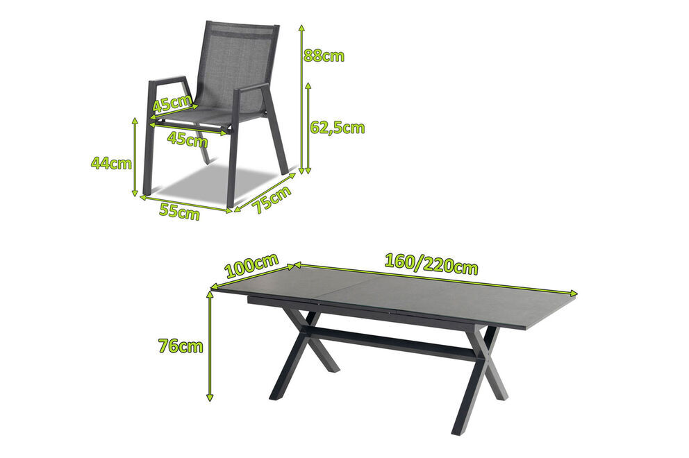 Das gekreuzte Gestell ist gefertigt aus pulverbeschichtetem Aluminium in der Farbe Xerix (Anthrazit) und wird optisch perfekt durch die Glaskeramik-Tischplatte, ebenfalls in der Farbe Xerix ergänzt. Die Maße von ca. 160 x 100 x 75 cm sorgen dafür, dass stets ausreichend Ablagefläche zur Verfügung steht. Bei Bedarf kann der Tisch auf eine Länge von ca. 220 cm ausgezogen werden, so finden bequem auch große Runden genügend Platz in Ihrem Garten. Dank der Ausziehfunktion hebt sich dieses Modell von den üblichen Tischen der Xanadu Serie ab - den Ausziehtisch erhalten Sie exklusiv bei uns.