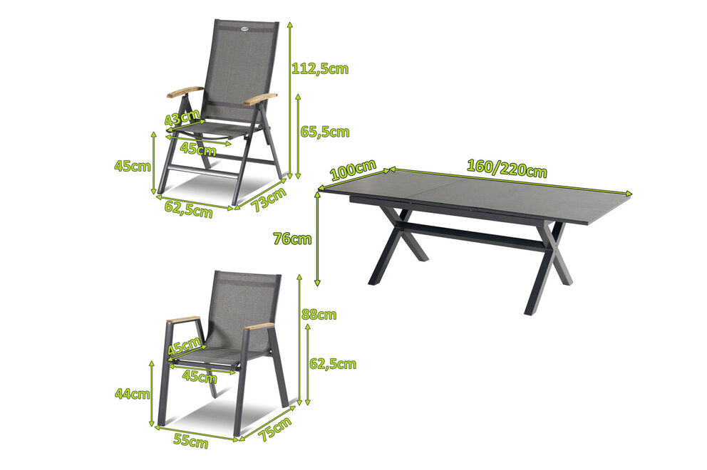 Die Sessel aus der Aruba-Serie von Hartman werden Sie mit der qualitativ hochwertigen Verarbeitung und der Verwendung ausgesuchter Materialien überzeugen. Das Gestell aus robusten Aluminium sorgt für ein geringes Eigengewicht von nur ca. 3,4 kg bzw. 4,6 kg, sodass sich die Sessel kinderleicht verschieben lassen. Trotzdem können diese mit bis zu ca. 130 kg belastet werden. Die schlichte Optik, mit dem pulverbeschichtetem Aluminiumrahmen in xerix, den Armlehnen aus Teakholz und der besonderen Textilenbespannung machen die Sessel zu einem besonderen Hingucker. Dank der Stoffzusammensetzung aus 70% Polyvinylchlorid und 30% Polyester profitieren Sie von einer langen Haltbarkeit. Sie werden gar nicht mehr aufstehen wollen, denn das witterungsbeständige Material ist durch seine Flexibilität auch ohne Auflagen sehr bequem. Ob Sie beim Essen ganz aufrecht sitzen möchten oder sich in der Sonne zurücklehnen wollen, Sie finden dank der 6-fachen Verstellbarkeit der Multipo immer die richtige Sitzposition. Ebenso schnell und unkompliziert können Sie diese zusammenklappen, sowie die Dining Sessel einfach stapeln und platzsparend verstauen.
