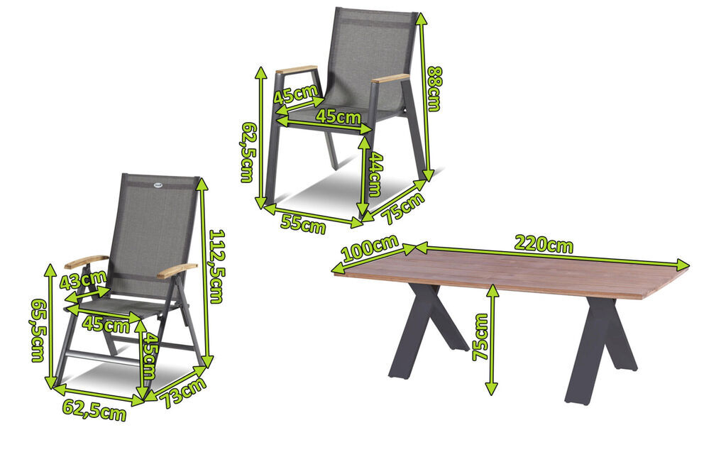 Der Tisch mit dem gekreuzten Gestell ist gefertigt aus pulverbeschichtetem Aluminium in der Farbe Xerix (Anthrazit) und wird optisch perfekt durch die Tischplatte aus SVLK-zertifiziertem Teakholz ergänzt. Die Maße von ca. 220 x 100 x 75 cm sorgen dafür, dass stets ausreichend Ablagefläche zur Verfügung steht und bequem 8 Personen genügend Platz finden.