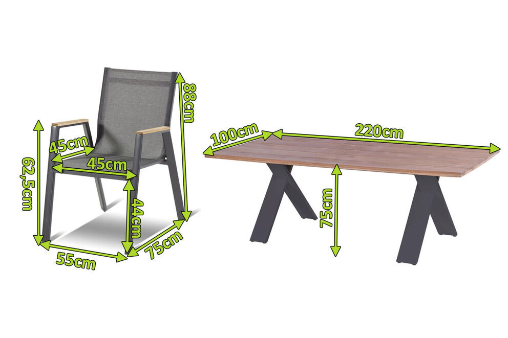 Der Tisch mit dem gekreuzten Gestell ist gefertigt aus pulverbeschichtetem Aluminium in der Farbe Xerix (Anthrazit) und wird optisch perfekt durch die Tischplatte aus SVLK-zertifiziertem Teakholz ergänzt. Die Maße von ca. 220 x 100 x 75 cm sorgen dafür, dass stets ausreichend Ablagefläche zur Verfügung steht und bequem 8 Personen genügend Platz finden.