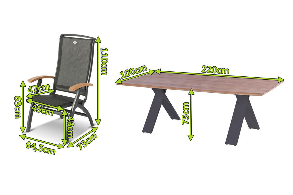 Der Tisch mit dem gekreuzten Gestell ist gefertigt aus pulverbeschichtetem Aluminium in der Farbe Xerix (Anthrazit) und wird optisch perfekt durch die Tischplatte aus SVLK-zertifiziertem Teakholz ergänzt. Die Maße von ca. 220 x 100 x 75 cm sorgen dafür, dass stets ausreichend Ablagefläche zur Verfügung steht und bequem 8 Personen genügend Platz finden.