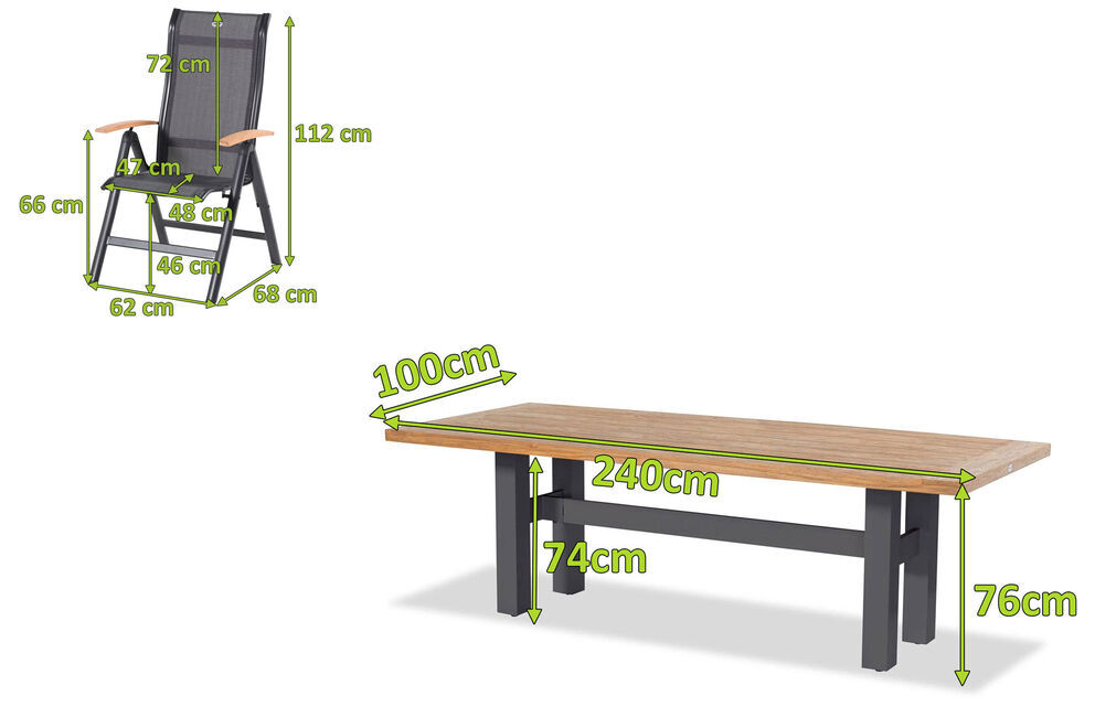 Die Klappstühle überzeugen durch ihre schlichte Optik mit dem pulverbeschichteten Aluminiumrahmen in der Farbe Xerix, dem gleichfarbigen 2x2 Textilen-Gewebe (70% Polyvinylchlorid, 30% Polyester) und den Armlehnen aus edlem robusten Teakholz aus. Auch funktional überzeugen diese bequemen Gartensessel: Die Rückenlehne lässt sich kinderleicht in mehreren Stufen verstellen und bietet damit einen hervorragenden Sitzkomfort. Dank des Aluminiumgestells sind die Sessel mit einem Gewicht von ca. 5,3 kg zudem leicht und einfach zu transportieren.