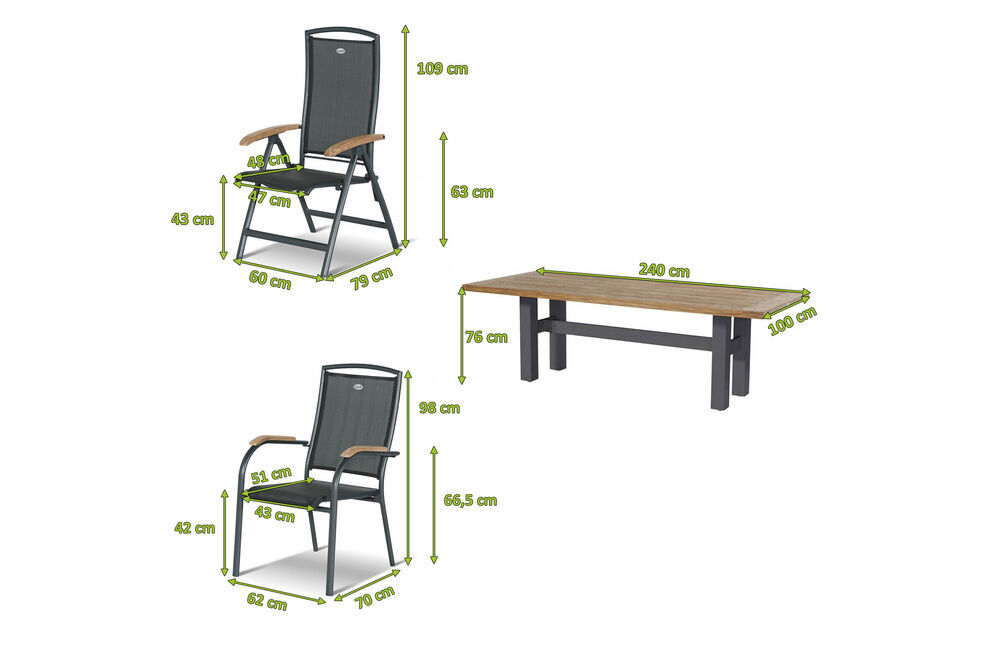 Der Tisch besteht aus einem hochwertigen Aluminiumgestell in der Farbe 'Xerix' (Anthrazit) und einer ca. 4 cm dicken Teakholz-Tischplatte in einem natürlichen Teak-Farbton. Damit hebt sich dieses Modell von den üblichen Tischen aus der Yasmani-Serie ab, denn diese gibt es normalerweise nur mit einer Tischplatte in der Farbe 'Vintage Brown', also mit einer deutlich dunkleren Tischplatte. Das bei diesem Tisch verwendete Teakholz wurde allerdings so behandelt, dass es zu 100% dem FSC-Teakholz Farbton entspricht und damit perfekt zu den im Set inbegriffenen Sesseln aus der 'Alice Comfort'-Serie passt. Mit seiner Größe von ca. 240 x 100 x 77 cm bietet er dabei ausreichend Platz für 8 Personen.