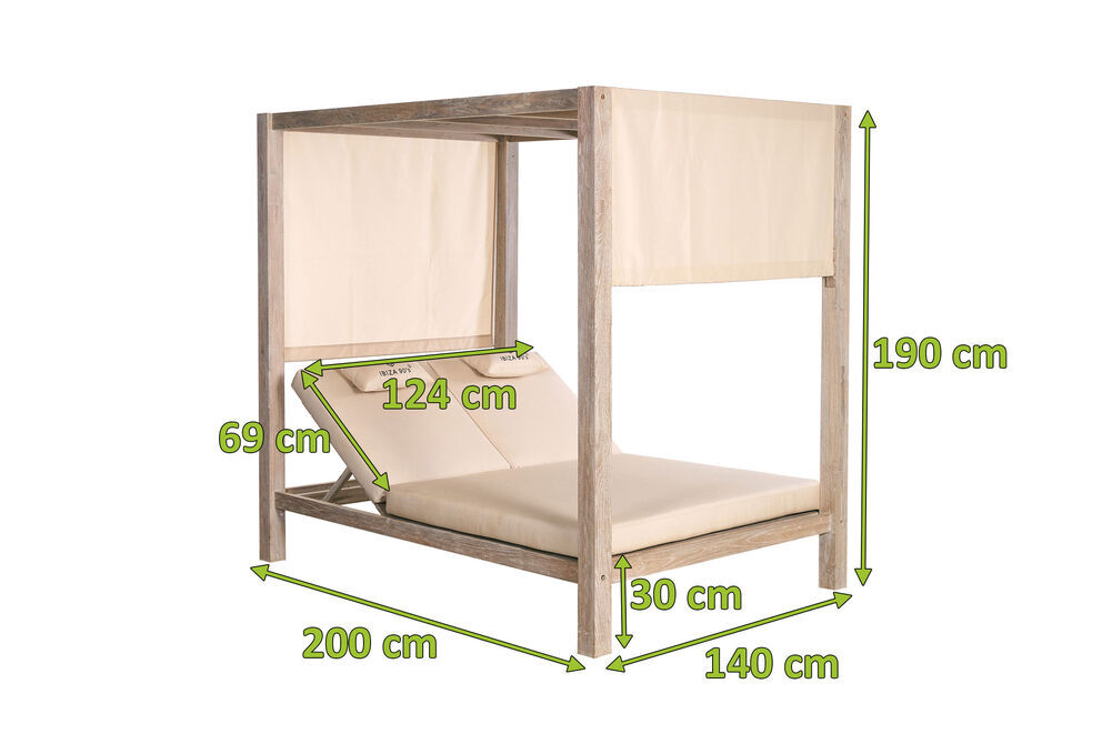Das Loungebett ist ca. 200 x 140 x 190 cm groß und hat eine Sitzhöhe von ca. 30 cm. Zudem bietet es eine 4-fach verstellbare Rückenlehne, mit der Sie die Liegefläche zu Ihren Wünschen anpassen können. Die gemütlichen beigen Sitzpolster aus Olefin (100 % Polyester) mit einer Stärke von ca. 10 cm sorgen für höchsten Sitz- und Liegekomfort. Das Untergestell ist aus stabilem FSC-zertifiziertem recyceltem Teakholz gefertigt. Wenn Sie auf der Suche nach einem imposanten Loungebett sind, das Ihren gehobenen Qualitäts- und Designansprüchen gerecht wird, dann machen Sie mit diesem Highlight keinen Fehler. An sonnigen Tagen verwenden Sie einfach die Sonnenschutzvorhänge, die Ihnen angenehmen Schatten spenden und außerdem auch vor Wind schützt. Die Vorhänge lassen sich ganz leicht in mehrere Positionen verstellen und durch ein Einrastsystem bequem feststellen lassen. Da nicht immer die Sonne scheint, sorgt die Wetterbeständigkeit und Pflegeleichtigkeit des Materials für den nötigen Schutz. Die synthetische Faser Olefin (100% Polyester) wird für ihre Hitzebeständigkeit und optimalen Trage- und Pflegeeigenschaften geschätzt.