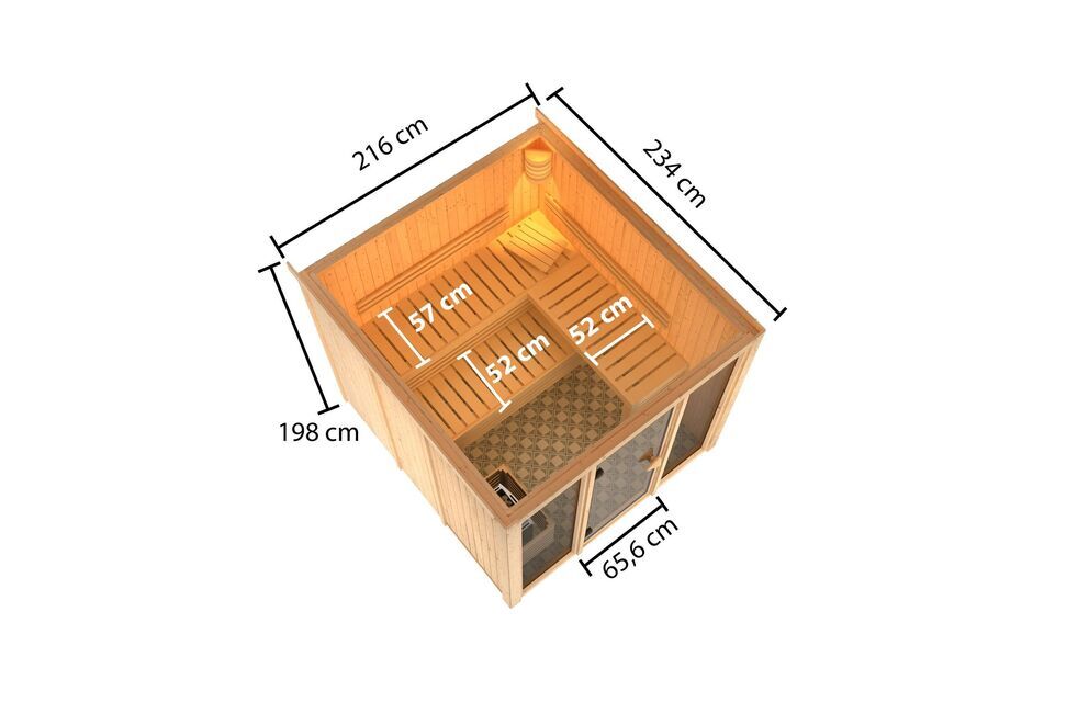 Die KARIBU 68 mm System Sauna Askja mit Fronteinstieg ist dank ihrer Größe sehr kompakt und benötigt wenig Platz. Mit ihren Außenmaßen von ca. 216 x 234 x 198 cm, einer Grundfläche von 4,6 m² und einem umbauten Raum von 8,2 m³ bietet diese Sauna für alle Anforderungen ausreichend Platz. Das Modell wird mit Wandbrettern im Steck-/Schraubsystem gefertigt und kann somit rasch und einfach aufgebaut werden.