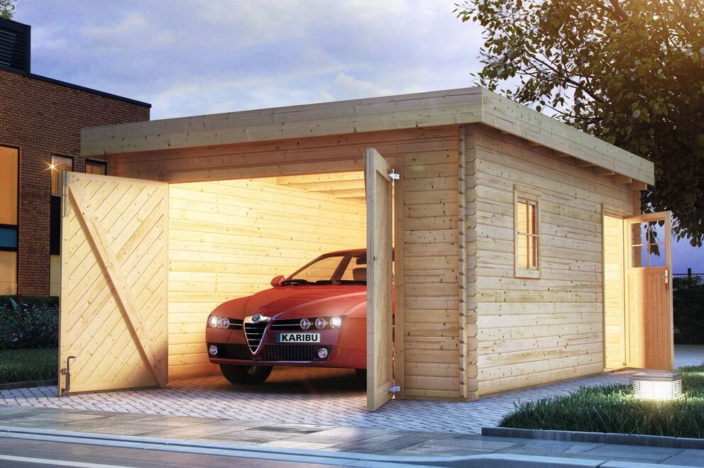 Die Holzgarage von KARIBU bietet für Ihr Auto mit einem Außenmaß von ca. 387 x 537 cm viel aus bestem naturbelassenem Fichtenholz. Mit 40 mm Wandstärke ist die Stabilität über jeden Zweifel erhaben. Der Zugang oder die Zufahrt zu der schönen Blockbohlengarage wird durch das große Doppel-Holztor mit einem Durchfahrtsmaß von ca. 238 x 193 cm gewährleistet. Öffnet man dieses Tor, hat man Zugang zum ca. 365 x 514 cm großen Innenraum. In der Seitenwand sorgt eine Einzeltür mit einem lichten Maß von ca. 82,5 x 170 cm mit zusätzlichem Fenster im Türflügel dafür, dass man nicht immer das große Tor öffnen muss, wenn man nur kleine Dinge verstauen will. Das Satteldach aus Massivholzbrettern sorgt für langfristigen Schutz gegen Witterungseinflüsse. Die Wandbohlen werden dank der patentierten 6-Plus-Eckverbindung besonders regen- und winddicht verbaut.