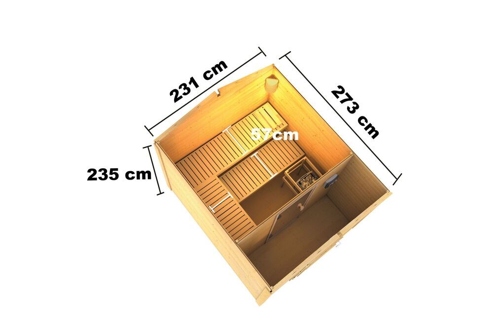 Das Saunahaus Bosse 1 aus nordischer Fichte von KARIBU wird aus 38 mm Wandbrettern im Steck-/Schraubsystem gefertigt und kann somit rasch und einfach aufgebaut werden. Das praktische Satteldach aus Massivholz sorgt dafür, dass das Saunahaus schnell und wirkungsvoll gegen Witterungseinflüsse geschützt ist. Mit ihren Außenmaßen von ca. 231 x 273 x 235 cm und den Innenmaßen von ca. 219 x 261 x 215 cm, einer Grundfläche von 6,11 m² und einem umbauten Raum von 13,0 m³ bietet diese Sauna für alle Anforderungen ausreichend Platz. Auch der geräumige Vorraum lädt zum geschützten Verweilen und Entspannen zwischen den Saunagängen ein.