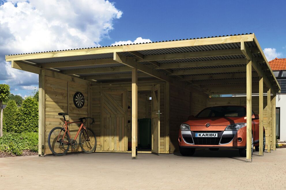 Das Doppelcarport Eco von KARIBU bietet Ihren Autos den Schutz den sie verdienen. Durch die massiven kesseldruckimprägnierten Pfosten mit einem Maß von je ca. 9 x 9 cm sorgt es mit dem ca. 27,2 m² (Eco 2 ca. 28,25 m²) großen Dach aus Kunststoff (ca. 0,8 mm) für ausreichend Stellfläche. Ihr Auto wird so effektiv vor der Sommersonne oder den Winterstürmen geschützt und hält gleichzeitig leichter einen hohen Restwert. Witterungseinflüsse wir Regen, Hagel oder herumfliegende Blätter bleiben ausgesperrt. Wind hingehen kann ungehindert durch das Carport zirkulieren und trocknet auch schnell wieder nass geparkte Autos. Die Verwendung von hochwertigen, passenden H-Ankern mit einer Länge von ca. 80 cm wird auf Grund der großen Dachflächen und der Windlasten dringend empfohlen. Optional kann das Carport mit Seiten- oder Rückwänden oder Geräteräumen ergänzt werden.