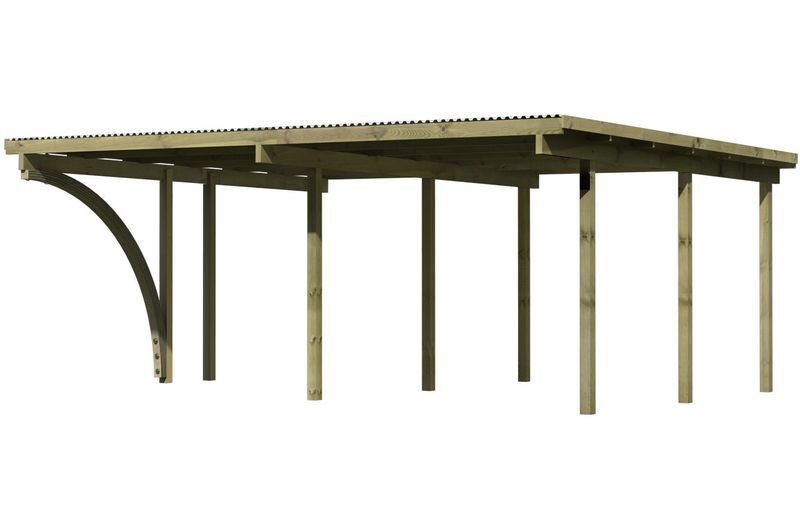 Das Doppelcarport Eco von KARIBU bietet Ihren Autos den Schutz den sie verdienen. Durch die massiven kesseldruckimprägnierten Pfosten mit einem Maß von je ca. 9 x 9 cm sorgt es mit dem ca. 27,2 m² (Eco 2 ca. 28,25 m²) großen Dach aus Kunststoff (ca. 0,8 mm) für ausreichend Stellfläche. Ihr Auto wird so effektiv vor der Sommersonne oder den Winterstürmen geschützt und hält gleichzeitig leichter einen hohen Restwert. Witterungseinflüsse wir Regen, Hagel oder herumfliegende Blätter bleiben ausgesperrt. Wind hingehen kann ungehindert durch das Carport zirkulieren und trocknet auch schnell wieder nass geparkte Autos. Die Verwendung von hochwertigen, passenden H-Ankern mit einer Länge von ca. 80 cm wird auf Grund der großen Dachflächen und der Windlasten dringend empfohlen. Optional kann das Carport mit Seiten- oder Rückwänden oder Geräteräumen ergänzt werden.