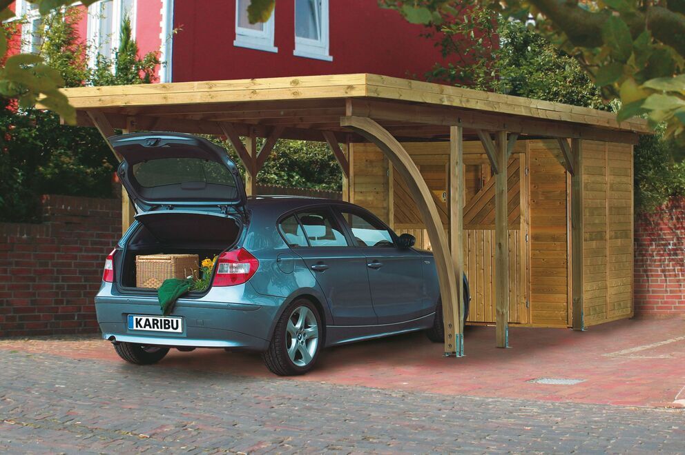 Das Einzelcarport Classic von KARIBU bietet Ihrem Auto den Schutz den es verdient. Durch die massiven kesseldruckimprägnierten Pfosten mit einem Maß von je ca. 12 x 12 cm sorgt es mit dem ca. 15 m² (Classic 2 ca. 20,9 m², Classic 3 ca. 26,9 m²) großen Dach aus Kunststoff (ca. 0,8 mm) für ausreichend Stellfläche. Ihr Auto wird so effektiv vor der Sommersonne oder den Winterstürmen geschützt und hält gleichzeitig leichter einen hohen Restwert. Witterungseinflüsse wir Regen, Hagel oder herumfliegende Blätter bleiben ausgesperrt. Wind hingehen kann ungehindert durch das Carport zirkulieren und trocknet auch schnell wieder nass geparkte Autos. Die Verwendung von hochwertigen, passenden H-Ankern mit einer Länge von ca. 80 cm wird auf Grund der großen Dachflächen und der Windlasten dringend empfohlen. Optional kann das Carport mit Seiten- oder Rückwänden oder Geräteräumen ergänzt werden.