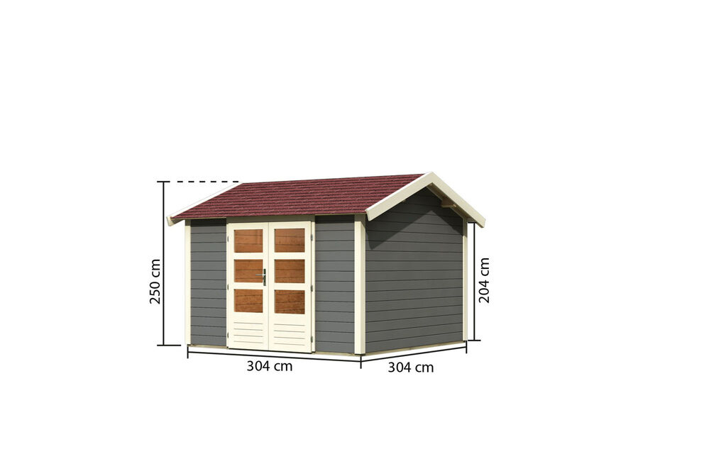 Das Gartenhaus Tharo aus nordischer Fichte von KARIBU wird mit 28 mm Wandbrettern im Steck-/Schraubsystem gefertigt und hat einen umbauten Raum von ca. 19,4 cbm und kann rasch und einfach aufgebaut werden. Das praktische Satteldach aus Massivholz sorgt dafür, dass das Gartenhaus schnell und wirkungsvoll gegen Witterungseinflüsse geschützt ist. Das Gartenhaus ohne Anbauten hat ein Sockelmaß von ca. 300 cm x 300 cm. Kesseldruckimprägnierte Bodenbalken sorgen für optimalen Schutz gegen aufsteigende Feuchtigkeit. Durch die Positionierung unter dem Gartenhaus schützen die Bodenbalken effektiv vor Staunässe und Spritzwasser. Das Gartenhaus wird mit der, praktischerweise schon vormontierten Tür, im stabilen Massivholzrahmen ausgeliefert und bietet dank der großen Öffnung bequemen Zutritt in das Haus. Nebenbei bietet das Gartenhaus dank des Zylinderschlosses mit drei mitgelieferten Schlüsseln effektiven Schutz vor Diebstahl. Gleichzeitig sorgt die Verglasung der Lichtausschnitte effektiv für einen großzügigen Tageslichteinfall.