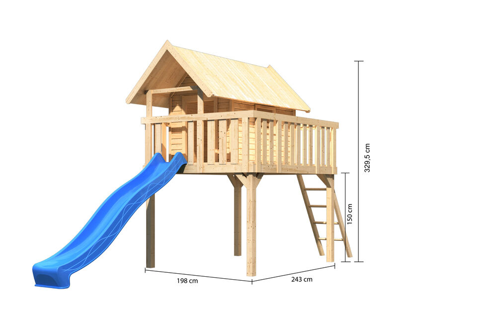 Das riesige Stelzenhaus Frieda von KARIBU in wahlweise terragrau oder naturbelassen, überzeugt mit extrem hoher Stabilität. Die Grundkonstruktion aus ca. 6,8 x 6,8 cm starken Massivholzpfosten ist für eine höhere Witterungresistenz kesseldruckimprägniert und bestehen aus Fichtenholz. Die ca. 18 mm dicken Wandbretter und das Dach sowie die Fußbodenbretter sind ebenfalls aus Holz hergestellt. Die Wandbretter werden im einfachen Steck/-Schraubsystem montiert, sodass schnell der neue Traum Ihrer Kinder im eigenen Garten steht. Die über die gesamte Front reichende Terrasse ist auf der Längsseite mit einem Brüstungselement, ebenfalls aus nordischer Fichte, versehen und bietet so ausreichenden Schutz. Die Podesthöhe von ca. 125 cm eignet sich ideal für Kinder jeder Altersklasse. Die Tür- und Fensteröffnungen sind aus Sicherheitsgründen nicht verschlossen. Auch das Haus Frieda hat ein Zertifikat vom TÜV-Nord für geprüfte Sicherheit (GS) nach DIN EN 71-1, DIN EN 71-3, DIN EN 71-8 und AfPS GS 2014. Auch können Sie die Farbe der Rutsche gemäß der Lieblingsfarbe Ihres Kindes eigens bestimmen. Weitere Varianten finden Sie in der Auswahl, sodass Sie auch dieses Haus nach Ihren Wünschen entsprechend gestalten können. Das riesige Zubehörsortiment sorgt dafür, dass Ihrer Phantasie keine Grenzen gesetzt sind. Als besonderes Highlight sind die außergewöhnlich schönen Farbsets zu nennen, die es Ihnen erlauben, das Stelzenhaus Frieda komplett einzigartig zu machen. Lassen Sie sich in der entsprechenden Zubehörrubrik inspirieren.