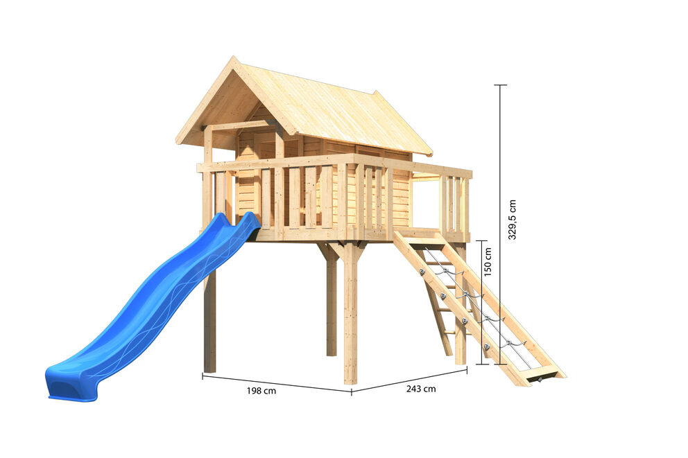 Das riesige Stelzenhaus Frieda von KARIBU in wahlweise terragrau oder naturbelassen, überzeugt mit extrem hoher Stabilität. Die Grundkonstruktion aus ca. 6,8 x 6,8 cm starken Massivholzpfosten ist für eine höhere Witterungresistenz kesseldruckimprägniert und bestehen aus Fichtenholz. Die ca. 18 mm dicken Wandbretter und das Dach sowie die Fußbodenbretter sind ebenfalls aus Holz hergestellt. Die Wandbretter werden im einfachen Steck/-Schraubsystem montiert, sodass schnell der neue Traum Ihrer Kinder im eigenen Garten steht. Die über die gesamte Front reichende Terrasse ist auf der Längsseite mit einem Brüstungselement, ebenfalls aus nordischer Fichte, versehen und bietet so ausreichenden Schutz. Die Podesthöhe von ca. 125 cm eignet sich ideal für Kinder jeder Altersklasse. Die Tür- und Fensteröffnungen sind aus Sicherheitsgründen nicht verschlossen. Auch das Haus Frieda hat ein Zertifikat vom TÜV-Nord für geprüfte Sicherheit (GS) nach DIN EN 71-1, DIN EN 71-3, DIN EN 71-8 und AfPS GS 2014. Auch können Sie die Farbe der Rutsche gemäß der Lieblingsfarbe Ihres Kindes eigens bestimmen. Weitere Varianten finden Sie in der Auswahl, sodass Sie auch dieses Haus nach Ihren Wünschen entsprechend gestalten können. Das riesige Zubehörsortiment sorgt dafür, dass Ihrer Phantasie keine Grenzen gesetzt sind. Als besonderes Highlight sind die außergewöhnlich schönen Farbsets zu nennen, die es Ihnen erlauben, das Stelzenhaus Frieda komplett einzigartig zu machen. Lassen Sie sich in der entsprechenden Zubehörrubrik inspirieren.