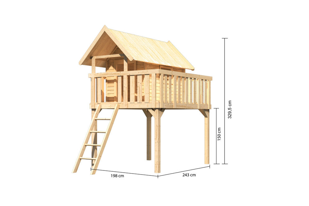Das riesige Stelzenhaus Frieda von KARIBU in wahlweise terragrau oder naturbelassen, überzeugt mit extrem hoher Stabilität. Die Grundkonstruktion aus ca. 6,8 x 6,8 cm starken Massivholzpfosten ist für eine höhere Witterungresistenz kesseldruckimprägniert und bestehen aus Fichtenholz. Die ca. 18 mm dicken Wandbretter und das Dach sowie die Fußbodenbretter sind ebenfalls aus Holz hergestellt. Die Wandbretter werden im einfachen Steck/-Schraubsystem montiert, sodass schnell der neue Traum Ihrer Kinder im eigenen Garten steht. Die über die gesamte Front reichende Terrasse ist auf der Längsseite mit einem Brüstungselement, ebenfalls aus nordischer Fichte, versehen und bietet so ausreichenden Schutz. Die Podesthöhe von ca. 125 cm eignet sich ideal für Kinder jeder Altersklasse. Die Tür- und Fensteröffnungen sind aus Sicherheitsgründen nicht verschlossen. Auch das Haus Frieda hat ein Zertifikat vom TÜV-Nord für geprüfte Sicherheit (GS) nach DIN EN 71-1, DIN EN 71-3, DIN EN 71-8 und AfPS GS 2014. Auch können Sie die Farbe der Rutsche gemäß der Lieblingsfarbe Ihres Kindes eigens bestimmen. Weitere Varianten finden Sie in der Auswahl, sodass Sie auch dieses Haus nach Ihren Wünschen entsprechend gestalten können. Das riesige Zubehörsortiment sorgt dafür, dass Ihrer Phantasie keine Grenzen gesetzt sind. Als besonderes Highlight sind die außergewöhnlich schönen Farbsets zu nennen, die es Ihnen erlauben, das Stelzenhaus Frieda komplett einzigartig zu machen. Lassen Sie sich in der entsprechenden Zubehörrubrik inspirieren.