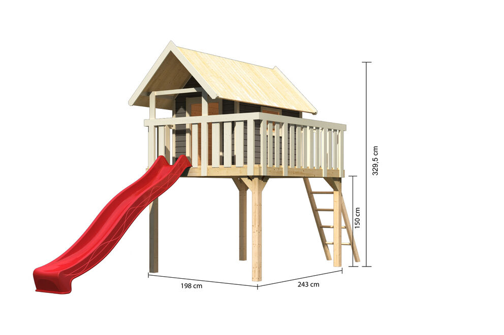 Das riesige Stelzenhaus Frieda von KARIBU in wahlweise terragrau oder naturbelassen, überzeugt mit extrem hoher Stabilität. Die Grundkonstruktion aus ca. 6,8 x 6,8 cm starken Massivholzpfosten ist für eine höhere Witterungresistenz kesseldruckimprägniert und bestehen aus Fichtenholz. Die ca. 18 mm dicken Wandbretter und das Dach sowie die Fußbodenbretter sind ebenfalls aus Holz hergestellt. Die Wandbretter werden im einfachen Steck/-Schraubsystem montiert, sodass schnell der neue Traum Ihrer Kinder im eigenen Garten steht. Die über die gesamte Front reichende Terrasse ist auf der Längsseite mit einem Brüstungselement, ebenfalls aus nordischer Fichte, versehen und bietet so ausreichenden Schutz. Die Podesthöhe von ca. 125 cm eignet sich ideal für Kinder jeder Altersklasse. Die Tür- und Fensteröffnungen sind aus Sicherheitsgründen nicht verschlossen. Auch das Haus Frieda hat ein Zertifikat vom TÜV-Nord für geprüfte Sicherheit (GS) nach DIN EN 71-1, DIN EN 71-3, DIN EN 71-8 und AfPS GS 2014. Auch können Sie die Farbe der Rutsche gemäß der Lieblingsfarbe Ihres Kindes eigens bestimmen. Weitere Varianten finden Sie in der Auswahl, sodass Sie auch dieses Haus nach Ihren Wünschen entsprechend gestalten können. Das riesige Zubehörsortiment sorgt dafür, dass Ihrer Phantasie keine Grenzen gesetzt sind. Als besonderes Highlight sind die außergewöhnlich schönen Farbsets zu nennen, die es Ihnen erlauben, das Stelzenhaus Frieda komplett einzigartig zu machen. Lassen Sie sich in der entsprechenden Zubehörrubrik inspirieren.