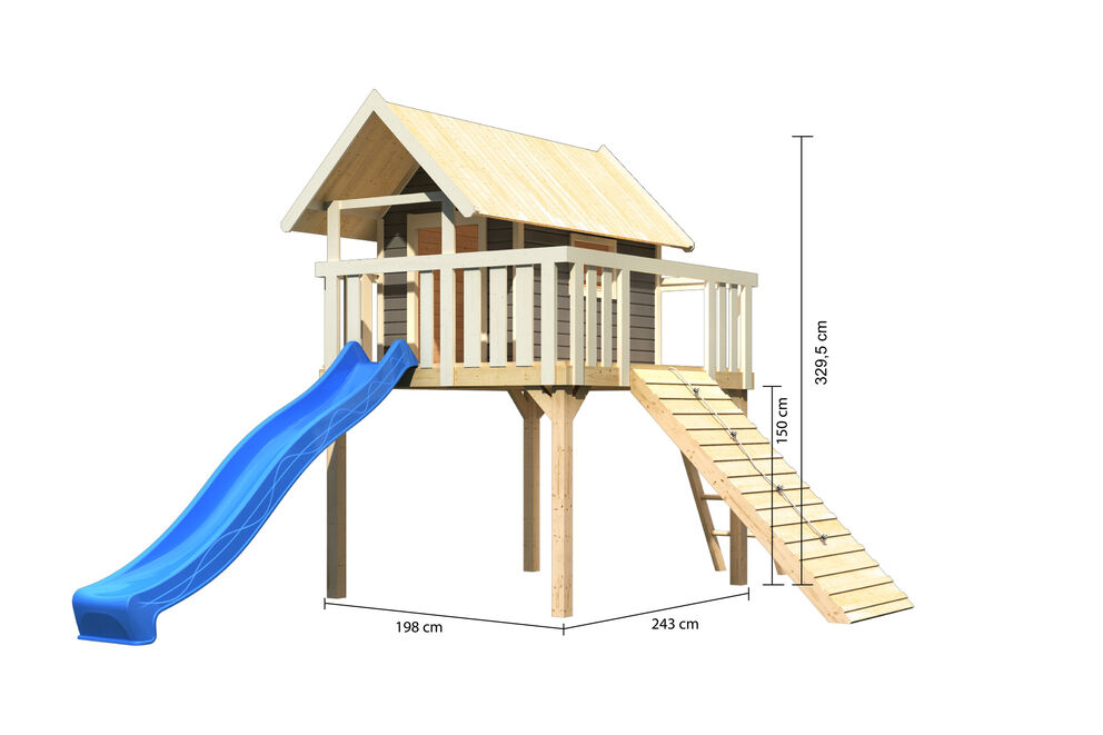 Das riesige Stelzenhaus Frieda von KARIBU in wahlweise terragrau oder naturbelassen, überzeugt mit extrem hoher Stabilität. Die Grundkonstruktion aus ca. 6,8 x 6,8 cm starken Massivholzpfosten ist für eine höhere Witterungresistenz kesseldruckimprägniert und bestehen aus Fichtenholz. Die ca. 18 mm dicken Wandbretter und das Dach sowie die Fußbodenbretter sind ebenfalls aus Holz hergestellt. Die Wandbretter werden im einfachen Steck/-Schraubsystem montiert, sodass schnell der neue Traum Ihrer Kinder im eigenen Garten steht. Die über die gesamte Front reichende Terrasse ist auf der Längsseite mit einem Brüstungselement, ebenfalls aus nordischer Fichte, versehen und bietet so ausreichenden Schutz. Die Podesthöhe von ca. 125 cm eignet sich ideal für Kinder jeder Altersklasse. Die Tür- und Fensteröffnungen sind aus Sicherheitsgründen nicht verschlossen. Auch das Haus Frieda hat ein Zertifikat vom TÜV-Nord für geprüfte Sicherheit (GS) nach DIN EN 71-1, DIN EN 71-3, DIN EN 71-8 und AfPS GS 2014. Auch können Sie die Farbe der Rutsche gemäß der Lieblingsfarbe Ihres Kindes eigens bestimmen. Weitere Varianten finden Sie in der Auswahl, sodass Sie auch dieses Haus nach Ihren Wünschen entsprechend gestalten können. Das riesige Zubehörsortiment sorgt dafür, dass Ihrer Phantasie keine Grenzen gesetzt sind. Als besonderes Highlight sind die außergewöhnlich schönen Farbsets zu nennen, die es Ihnen erlauben, das Stelzenhaus Frieda komplett einzigartig zu machen. Lassen Sie sich in der entsprechenden Zubehörrubrik inspirieren.