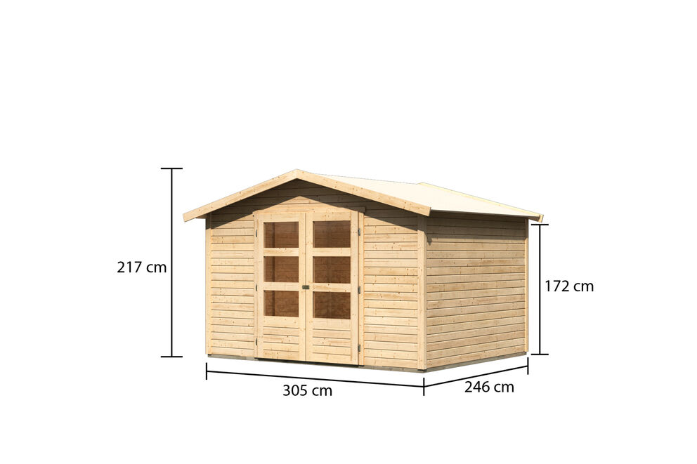 Das Gartenhaus Amberg aus nordischer Fichte von KARIBU wird aus 19 mm Wandbrettern im Steck-/Schraubsystem gefertigt und kann somit rasch und einfach aufgebaut werden. Das praktische Satteldach aus Dachplatte sorgt dafür, dass das Gartenhaus schnell und wirkungsvoll gegen Witterungseinflüsse geschützt ist. Dank der Seitenhöhe von ca. 172 cm und einer Firsthöhe von ca. 201 cm sorgt das Haus innen für viel Platz. Kesseldruckimprägnierte Bodenbalken sorgen für optimalen Schutz gegen aufsteigende Feuchtigkeit. Durch die Positionierung unter dem Gartenhaus schützen die Bodenbalken effektiv vor Staunässe und Spritzwasser. Das Gartenhaus wird mit der, praktischerweise schon vormontierten Tür, im stabilen Massivholzrahmen ausgeliefert und bietet dank der großen Öffnung bequemen Zutritt in das Haus. Nebenbei bietet sie effektiven Schutz vor Diebstahl. Gleichzeitig lassen die großzügigen Lichtausschnitte im jeweiligen Türflügel ausreichend Tageslicht in das Gartenhaus einströmen.