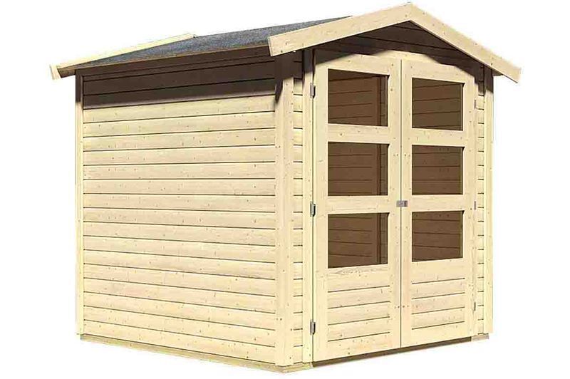 Das Gartenhaus Amberg aus nordischer Fichte von KARIBU wird aus 19 mm Wandbrettern im Steck-/Schraubsystem gefertigt und kann somit rasch und einfach aufgebaut werden. Das praktische Satteldach aus Dachplatte sorgt dafür, dass das Gartenhaus schnell und wirkungsvoll gegen Witterungseinflüsse geschützt ist. Das Haus hat eine Grundfläche, abhängig vom Modell von ca. 2,2 m² bis ca. 5,9 m². Dank der Seitenhöhe von ca. 172 cm und einer Firsthöhe von ca. 201 cm sorgt das Haus innen für viel Platz. Kesseldruckimprägnierte Bodenbalken sorgen für optimalen Schutz gegen aufsteigende Feuchtigkeit. Durch die Positionierung unter dem Gartenhaus schützen die Bodenbalken effektiv vor Staunässe und Spritzwasser. Das Gartenhaus wird mit der, praktischerweise schon vormontierten Tür, im stabilen Massivholzrahmen ausgeliefert und bietet dank der großen Öffnung bequemen Zutritt in das Haus. Nebenbei bietet sie effektiven Schutz vor Diebstahl. Gleichzeitig lassen die großzügigen Lichtausschnitte im jeweiligen Türflügel ausreichend Tageslicht in das Gartenhaus einströmen.