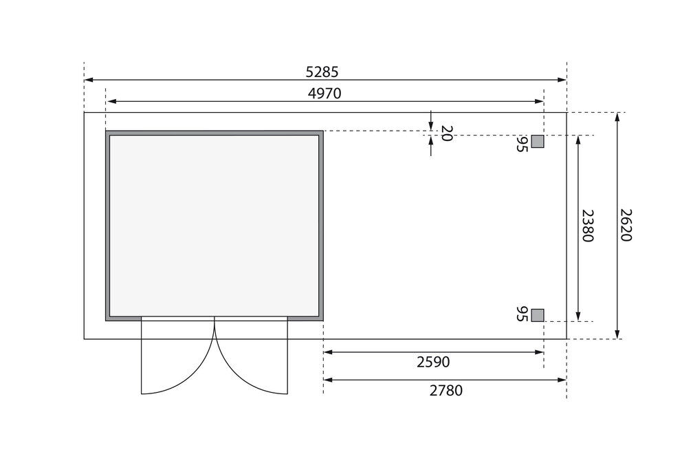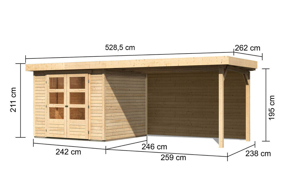 Das Gartenhaus Askola aus nordischer Fichte von KARIBU wird aus 19 mm Wandbrettern im Steck-/Schraubsystem gefertigt und kann somit rasch und einfach aufgebaut werden. Das praktische Flachdach aus Massivholz sorgt dafür, dass das Gartenhaus schnell und wirkungsvoll gegen Witterungseinflüsse geschützt ist. Dank der Seitenhöhe von ca. 195 cm und einer Firsthöhe von ca. 211 cm sorgt das Haus innen für viel Platz. Kesseldruckimprägnierte Bodenbalken sorgen für optimalen Schutz gegen aufsteigende Feuchtigkeit. Durch die Positionierung unter dem Gartenhaus schützen die Bodenbalken effektiv vor Staunässe und Spritzwasser. Das Gartenhaus wird mit der, praktischerweise schon vormontierten Tür, im stabilen Massivholzrahmen ausgeliefert und bietet dank der großen Öffnung bequemen Zutritt in das Haus. Nebenbei bietet sie effektiven Schutz vor Diebstahl. Gleichzeitig lassen die großzügigen Lichtausschnitte im jeweiligen Türflügel ausreichend Tageslicht in das Gartenhaus einströmen.