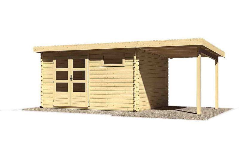 Das Blockbohlenhaus Bastrup 8 aus nordischer Fichte von KARIBU wird aus 28 mm Wandbohlen in klassischer Blockbohlenbauweise gefertigt und kann somit rasch und einfach aufgebaut werden. Bei der Blockbohlenbauweise werden die Wandbohlen reihum montiert. Begonnen wird mit einer halben, sprich unten glatten Bohle. Die patentierte 6-Plus-Eckverbindung sorgt dabei für höchste Wind- und Regendichtigkeit. Die Schraublöcher in den Blockbohlen sind werkseitig vorgefertigt und vereinfachen den Aufbau enorm. Das praktische Flachdach aus Massivholzdach sorgt dafür, dass das Gartenhaus schnell und wirkungsvoll gegen Witterungseinflüsse geschützt ist. Der vordere Dachüberstand ist mit ca. 28 cm ausreichend groß dimensioniert, um den Eingangsbereich wirkungsvoll zu schützen. Das Haus hat eine Grundfläche von ca. 10,4 m² und ca. 21,6 m³ umbauten Raum. Dank der Seitenhöhe von ca. 201 cm und einer Firsthöhe von ca. 222 cm sorgt das Haus innen für viel Platz. Kesseldruckimprägnierte Bodenbalken sorgen für optimalen Schutz gegen aufsteigende Feuchtigkeit. Durch die Positionierung unter dem Gartenhaus schützen die Bodenbalken effektiv vor Staunässe und Spritzwasser. Das Gartenhaus wird mit der, praktischerweise schon vormontierten Tür, im stabilen Massivholzrahmen ausgeliefert und bietet dank der großen Öffnung bequemen Zutritt in das Haus. Nebenbei bietet sie effektiven Schutz vor Diebstahl. Gleichzeitig lassen die großzügigen Lichtausschnitte im jeweiligen Türflügel ausreichend Tageslicht in das Gartenhaus einströmen.