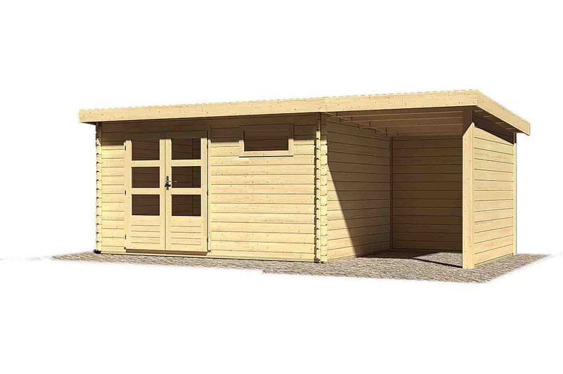 Das Blockbohlenhaus Bastrup 8 aus nordischer Fichte von KARIBU wird aus 28 mm Wandbohlen in klassischer Blockbohlenbauweise gefertigt und kann somit rasch und einfach aufgebaut werden. Bei der Blockbohlenbauweise werden die Wandbohlen reihum montiert. Begonnen wird mit einer halben, sprich unten glatten Bohle. Die patentierte 6-Plus-Eckverbindung sorgt dabei für höchste Wind- und Regendichtigkeit. Die Schraublöcher in den Blockbohlen sind werkseitig vorgefertigt und vereinfachen den Aufbau enorm. Das praktische Flachdach aus Massivholzdach sorgt dafür, dass das Gartenhaus schnell und wirkungsvoll gegen Witterungseinflüsse geschützt ist. Der vordere Dachüberstand ist mit ca. 28 cm ausreichend groß dimensioniert, um den Eingangsbereich wirkungsvoll zu schützen. Das Haus hat eine Grundfläche von ca. 10,4 m² und ca. 21,6 m³ umbauten Raum. Dank der Seitenhöhe von ca. 201 cm und einer Firsthöhe von ca. 222 cm sorgt das Haus innen für viel Platz. Kesseldruckimprägnierte Bodenbalken sorgen für optimalen Schutz gegen aufsteigende Feuchtigkeit. Durch die Positionierung unter dem Gartenhaus schützen die Bodenbalken effektiv vor Staunässe und Spritzwasser. Das Gartenhaus wird mit der, praktischerweise schon vormontierten Tür, im stabilen Massivholzrahmen ausgeliefert und bietet dank der großen Öffnung bequemen Zutritt in das Haus. Nebenbei bietet sie effektiven Schutz vor Diebstahl. Gleichzeitig lassen die großzügigen Lichtausschnitte im jeweiligen Türflügel ausreichend Tageslicht in das Gartenhaus einströmen.