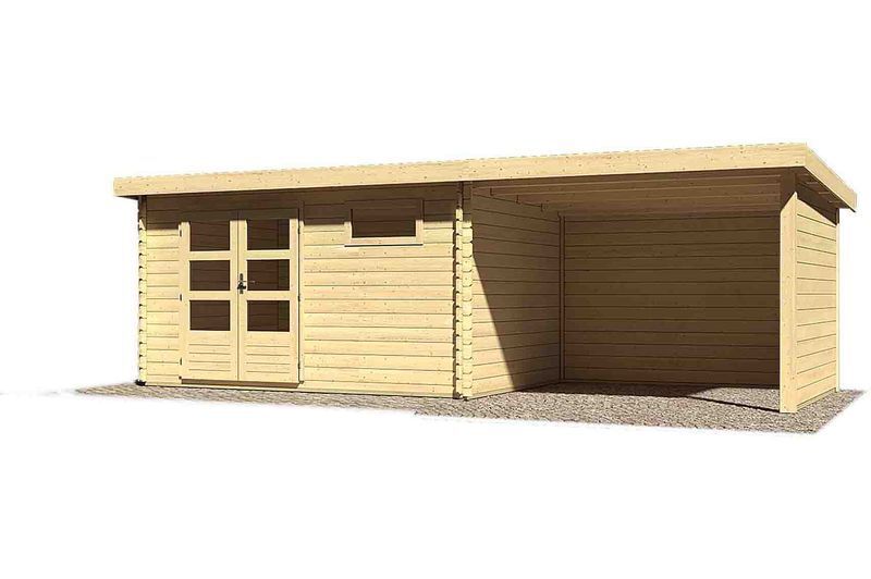 Das Blockbohlenhaus Bastrup 8 aus nordischer Fichte von KARIBU wird aus 28 mm Wandbohlen in klassischer Blockbohlenbauweise gefertigt und kann somit rasch und einfach aufgebaut werden. Bei der Blockbohlenbauweise werden die Wandbohlen reihum montiert. Begonnen wird mit einer halben, sprich unten glatten Bohle. Die patentierte 6-Plus-Eckverbindung sorgt dabei für höchste Wind- und Regendichtigkeit. Die Schraublöcher in den Blockbohlen sind werkseitig vorgefertigt und vereinfachen den Aufbau enorm. Das praktische Flachdach aus Massivholzdach sorgt dafür, dass das Gartenhaus schnell und wirkungsvoll gegen Witterungseinflüsse geschützt ist. Der vordere Dachüberstand ist mit ca. 28 cm ausreichend groß dimensioniert, um den Eingangsbereich wirkungsvoll zu schützen. Das Haus hat eine Grundfläche von ca. 10,4 m² und ca. 21,6 m³ umbauten Raum. Dank der Seitenhöhe von ca. 201 cm und einer Firsthöhe von ca. 222 cm sorgt das Haus innen für viel Platz. Kesseldruckimprägnierte Bodenbalken sorgen für optimalen Schutz gegen aufsteigende Feuchtigkeit. Durch die Positionierung unter dem Gartenhaus schützen die Bodenbalken effektiv vor Staunässe und Spritzwasser. Das Gartenhaus wird mit der, praktischerweise schon vormontierten Tür, im stabilen Massivholzrahmen ausgeliefert und bietet dank der großen Öffnung bequemen Zutritt in das Haus. Nebenbei bietet sie effektiven Schutz vor Diebstahl. Gleichzeitig lassen die großzügigen Lichtausschnitte im jeweiligen Türflügel ausreichend Tageslicht in das Gartenhaus einströmen.