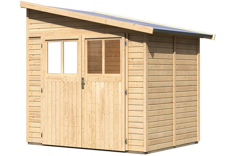 Das Gartenhaus Bomlitz aus nordischer Fichte von KARIBU wird aus 19 mm Wandbrettern im Steck-/Schraubsystem gefertigt und kann somit rasch und einfach aufgebaut werden. Das praktische Pultdach aus Massivholzdach sorgt dafür, dass das Gartenhaus schnell und wirkungsvoll gegen Witterungseinflüsse geschützt ist. Dank der Seitenhöhe von ca. 189 cm und einer Firsthöhe von ca. 243 cm sorgt das Haus innen für viel Platz. Kesseldruckimprägnierte Bodenbalken sorgen für optimalen Schutz gegen aufsteigende Feuchtigkeit. Durch die Positionierung unter dem Gartenhaus schützen die Bodenbalken effektiv vor Staunässe und Spritzwasser. Das Gartenhaus wird mit der, praktischerweise schon vormontierten Tür, im stabilen Massivholzrahmen ausgeliefert und bietet dank der großen Öffnung bequemen Zutritt in das Haus. Nebenbei bietet sie effektiven Schutz vor Diebstahl. Gleichzeitig lassen die großzügigen Lichtausschnitte im jeweiligen Türflügel ausreichend Tageslicht in das Gartenhaus einströmen.