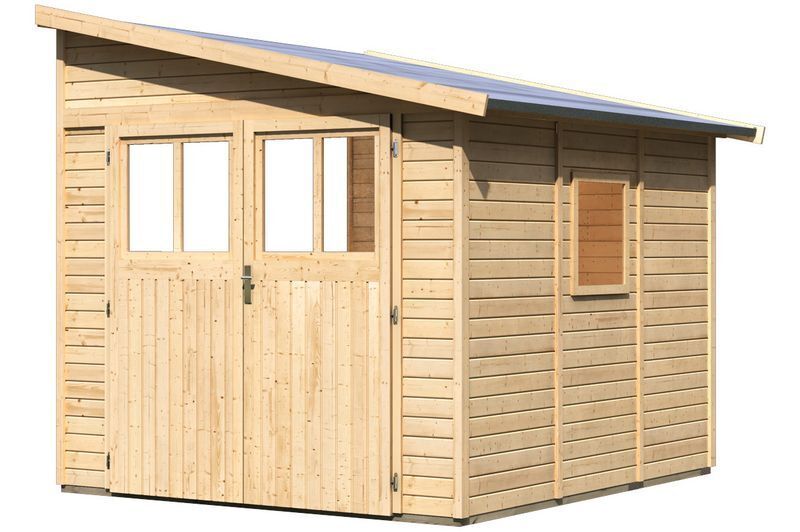 Das Gartenhaus Bomlitz aus nordischer Fichte von KARIBU wird aus 19 mm Wandbrettern im Steck-/Schraubsystem gefertigt und kann somit rasch und einfach aufgebaut werden. Das praktische Pultdach aus Massivholzdach sorgt dafür, dass das Gartenhaus schnell und wirkungsvoll gegen Witterungseinflüsse geschützt ist. Dank der Seitenhöhe von ca. 189 cm und einer Firsthöhe von ca. 243 cm sorgt das Haus innen für viel Platz. Kesseldruckimprägnierte Bodenbalken sorgen für optimalen Schutz gegen aufsteigende Feuchtigkeit. Durch die Positionierung unter dem Gartenhaus schützen die Bodenbalken effektiv vor Staunässe und Spritzwasser. Das Gartenhaus wird mit der, praktischerweise schon vormontierten Tür, im stabilen Massivholzrahmen ausgeliefert und bietet dank der großen Öffnung bequemen Zutritt in das Haus. Nebenbei bietet sie effektiven Schutz vor Diebstahl. Gleichzeitig lassen die großzügigen Lichtausschnitte im jeweiligen Türflügel ausreichend Tageslicht in das Gartenhaus einströmen.