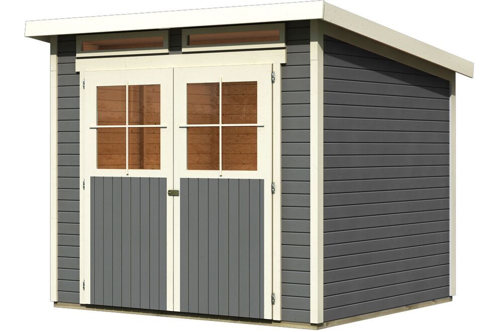 Das Gartenhaus Glücksburg 4 aus nordischer Fichte von KARIBU wird aus 19 mm Wandbrettern im Steck-/Schraubsystem gefertigt und kann somit rasch und einfach aufgebaut werden. Das praktische Pultdach aus Dachplatte sorgt dafür, dass das Gartenhaus schnell und wirkungsvoll gegen Witterungseinflüsse geschützt ist. Das Haus hat eine Grundfläche von ca. 5,07 m² und ca. 10,12 m³ umbauten Raum. Dank der Seitenhöhe von ca. 186 cm und einer Firsthöhe von ca. 220 cm sorgt das Haus innen für viel Platz. Das Gartenhaus hat ein Sockelmaß von ca. 238 x 213 cm (bzw. ca. 426 x 213 cm). Kesseldruckimprägnierte Bodenbalken sorgen für optimalen Schutz gegen aufsteigende Feuchtigkeit. Durch die Positionierung unter dem Gartenhaus schützen die Bodenbalken effektiv vor Staunässe und Spritzwasser. Das Gartenhaus wird mit der, praktischerweise schon vormontierten Tür, im stabilen Massivholzrahmen ausgeliefert und bietet dank der großen Öffnung bequemen Zutritt in das Haus. Nebenbei bietet sie effektiven Schutz vor Diebstahl. Gleichzeitig lassen die großzügigen Lichtausschnitte im jeweiligen Türflügel ausreichend Tageslicht in das Gartenhaus einströmen. Sie können dieses Modell in vier unterschiedlichen Farben erwerben.