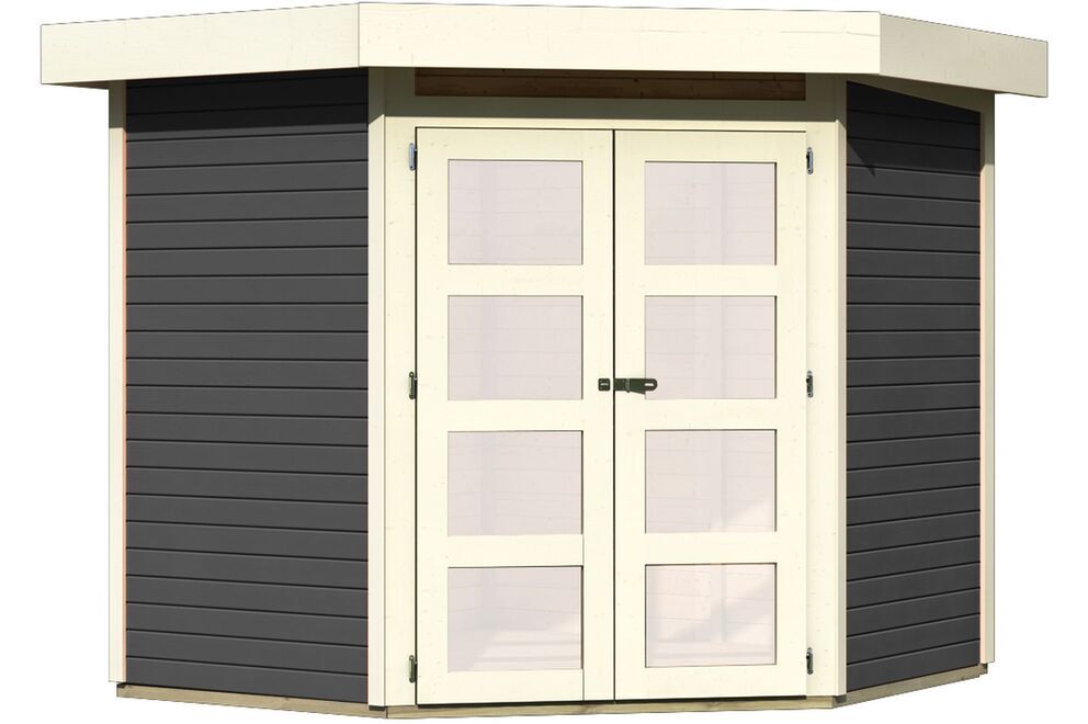 Das Gartenhaus Goldendorf 3 aus nordischer Fichte von KARIBU wird aus 19 mm Wandbrettern im Steck-/Schraubsystem gefertigt und kann somit rasch und einfach aufgebaut werden. Das praktische Flachdach aus Dachplatte sorgt dafür, dass das Gartenhaus schnell und wirkungsvoll gegen Witterungseinflüsse geschützt ist. Das Haus hat eine Grundfläche von ca. 4,5 m² und ca. 8,1 m³ umbauten Raum. Dank der Seitenhöhe von ca. 202/205 cm und einer Firsthöhe von ca. 218 cm sorgt das Haus innen für viel Platz. Kesseldruckimprägnierte Bodenbalken sorgen für optimalen Schutz gegen aufsteigende Feuchtigkeit. Durch die Positionierung unter dem Gartenhaus schützen die Bodenbalken effektiv vor Staunässe und Spritzwasser. Das Gartenhaus wird mit der, praktischerweise schon vormontierten Tür, im stabilen Massivholzrahmen ausgeliefert und bietet dank der großen Öffnung bequemen Zutritt in das Haus. Nebenbei bietet sie effektiven Schutz vor Diebstahl. Gleichzeitig lassen die großzügigen Lichtausschnitte im jeweiligen Türflügel ausreichend Tageslicht in das Gartenhaus einströmen. Sie können dieses Modell in zwei unterschiedlichen Farben erwerben.