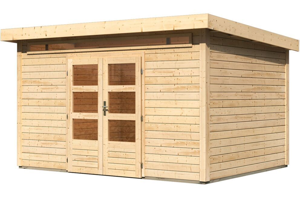 Das große Gartenhaus Kadern 9 aus nordischer Fichte von KARIBU wird aus 28 mm Wandbrettern im Steck-/Schraubsystem gefertigt und kann somit rasch und einfach aufgebaut werden. Dabei ist es dank der breiten Wandbretter sehr stabil. Das praktische Pultdach aus Massivholzdach sorgt dafür, dass das Gartenhaus schnell und wirkungsvoll gegen Witterungseinflüsse geschützt ist. Das Haus hat eine Grundfläche von ca. 10,8 m² und ca. 22,9 m³ umbauten Raum. Dank der Seitenhöhe von ca. 194 cm und einer Firsthöhe von ca. 232 cm sorgt das Gartenhaus innen viel Platz. Das Gartenhaus hat ein Sockelmaß von ca. 360 x 300 cm. Kesseldruckimprägnierte Bodenbalken sorgen für optimalen Schutz gegen aufsteigende Feuchtigkeit. Durch die Positionierung unter dem Gartenhaus schützen die Bodenbalken effektiv vor Staunässe und Spritzwasser. Das Gartenhaus wird mit der, praktischerweise schon vormontierten Tür, im stabilen Massivholzrahmen ausgeliefert und bietet dank der großen Öffnung bequemen Zutritt in das Haus. Nebenbei bietet sie effektiven Schutz vor Diebstahl. Gleichzeitig lassen die großzügigen Lichtausschnitte im jeweiligen Türflügel ausreichend Tageslicht in das Gartenhaus einströmen.