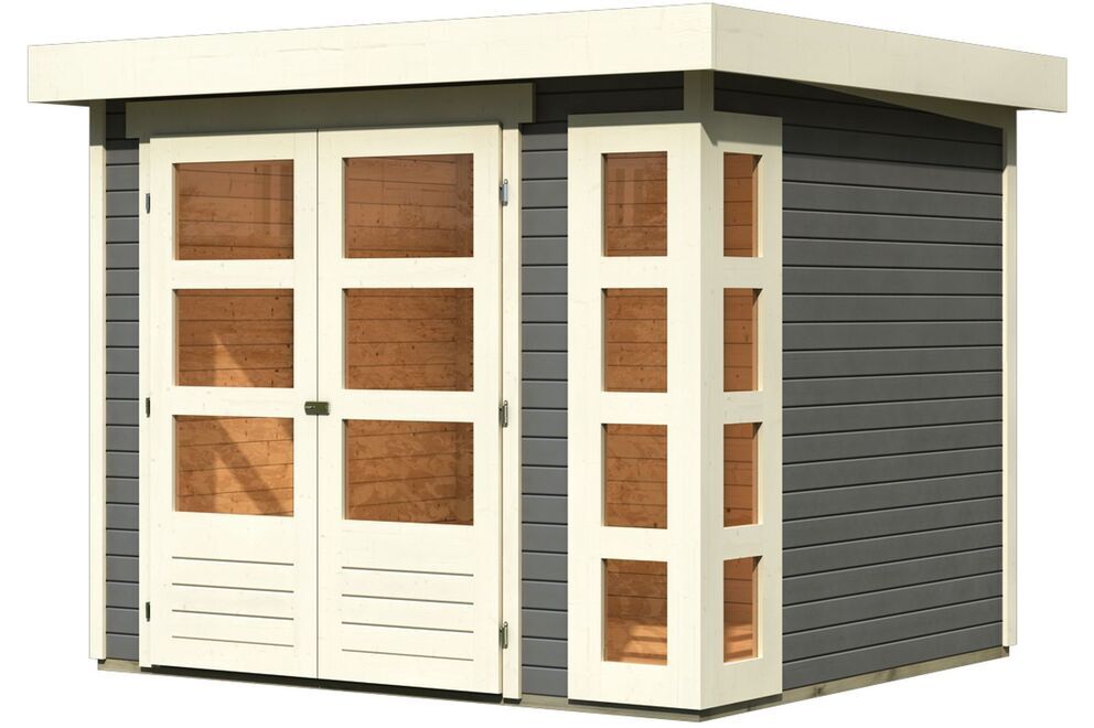 Das Gartenhaus Kerko 3 in naturbelassen oder terragrau aus nordischer Fichte von KARIBU wird aus 19 mm Wandbrettern im Steck-/Schraubsystem gefertigt und kann somit rasch und einfach aufgebaut werden. Das praktische Flachdach aus Dachplatte sorgt dafür, dass das Gartenhaus schnell und wirkungsvoll gegen Witterungseinflüsse geschützt ist. Das Haus hat eine Grundfläche von ca. 5,07 m² und ca. 10,2 m³ umbauten Raum. Dank der Seitenhöhe von ca. 195 cm und einer Firsthöhe von ca. 211 cm sorgt das Haus innen für viel Platz. Das Gartenhaus hat ein Sockelmaß von ca. 238 x 213 cm. Kesseldruckimprägnierte Bodenbalken sorgen für optimalen Schutz gegen aufsteigende Feuchtigkeit. Durch die Positionierung unter dem Gartenhaus schützen die Bodenbalken effektiv vor Staunässe und Spritzwasser. Das Gartenhaus wird mit der, praktischerweise schon vormontierten Tür, im stabilen Massivholzrahmen ausgeliefert und bietet dank der großen Öffnung bequemen Zutritt in das Haus. Nebenbei bietet sie effektiven Schutz vor Diebstahl. Gleichzeitig lassen die großzügigen Lichtausschnitte im jeweiligen Türflügel ausreichend Tageslicht in das Gartenhaus einströmen.