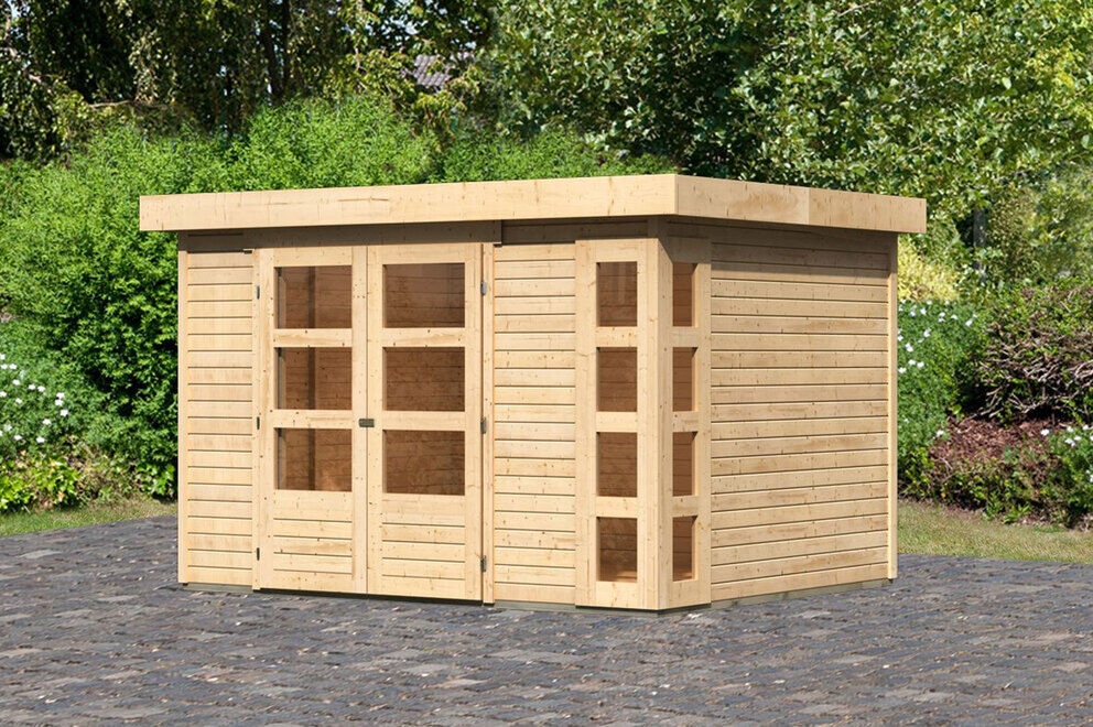 Das Gartenhaus Kerko aus nordischer Fichte von KARIBU wird aus 19 mm Wandbrettern im Steck-/Schraubsystem gefertigt und kann somit rasch und einfach aufgebaut werden. Das praktische Flachdach aus Massivholz sorgt dafür, dass das Gartenhaus schnell und wirkungsvoll gegen Witterungseinflüsse geschützt ist. Dank der Seitenhöhe von ca. 193 cm und einer Firsthöhe von ca. 210 cm sorgt das Haus innen für viel Platz. Kesseldruckimprägnierte Bodenbalken sorgen für optimalen Schutz gegen aufsteigende Feuchtigkeit. Durch die Positionierung unter dem Gartenhaus schützen die Bodenbalken effektiv vor Staunässe und Spritzwasser. Das Gartenhaus wird mit der, praktischerweise schon vormontierten Tür, im stabilen Massivholzrahmen ausgeliefert und bietet dank der großen Öffnung bequemen Zutritt in das Haus. Nebenbei bietet sie effektiven Schutz vor Diebstahl. Gleichzeitig lassen die großzügigen Lichtausschnitte im jeweiligen Türflügel, sowie zwei Fenster über Eck, ausreichend Tageslicht in das Gartenhaus einströmen.