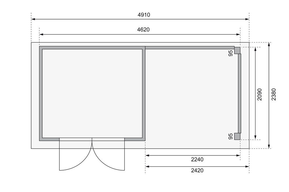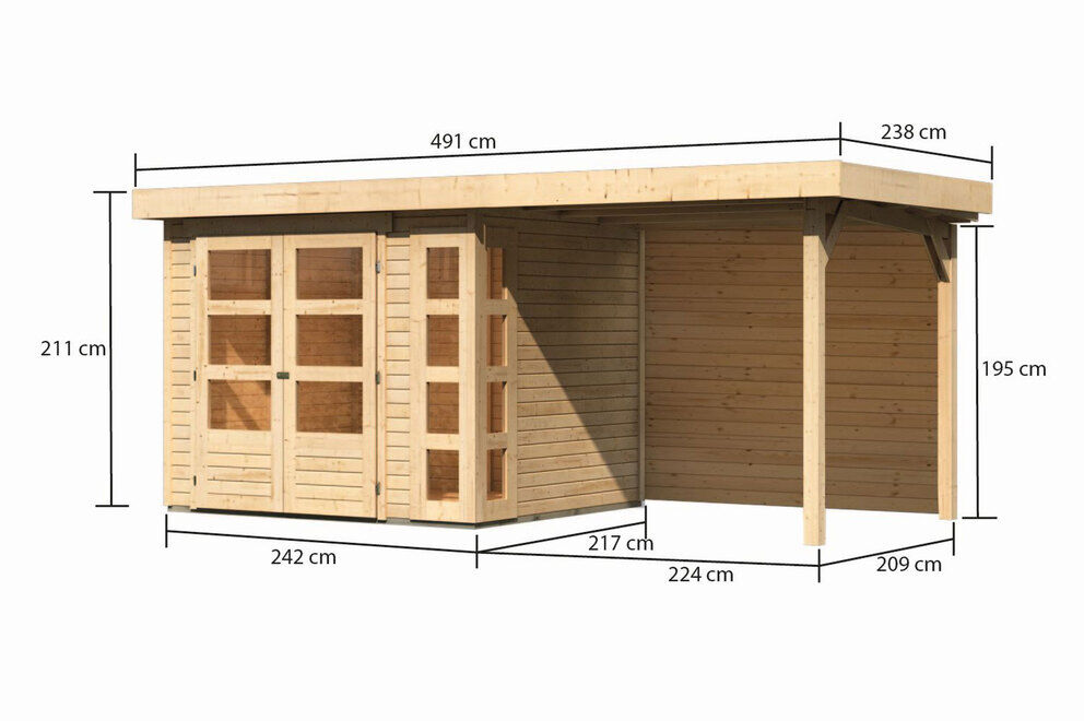 Das Gartenhaus Kerko aus nordischer Fichte von KARIBU wird aus 19 mm Wandbrettern im Steck-/Schraubsystem gefertigt und kann somit rasch und einfach aufgebaut werden. Das praktische Flachdach aus Massivholz sorgt dafür, dass das Gartenhaus schnell und wirkungsvoll gegen Witterungseinflüsse geschützt ist. Dank der Seitenhöhe von ca. 193 cm und einer Firsthöhe von ca. 210 cm sorgt das Haus innen für viel Platz. Kesseldruckimprägnierte Bodenbalken sorgen für optimalen Schutz gegen aufsteigende Feuchtigkeit. Durch die Positionierung unter dem Gartenhaus schützen die Bodenbalken effektiv vor Staunässe und Spritzwasser. Das Gartenhaus wird mit der, praktischerweise schon vormontierten Tür, im stabilen Massivholzrahmen ausgeliefert und bietet dank der großen Öffnung bequemen Zutritt in das Haus. Nebenbei bietet sie effektiven Schutz vor Diebstahl. Gleichzeitig lassen die großzügigen Lichtausschnitte im jeweiligen Türflügel, sowie zwei Fenster über Eck, ausreichend Tageslicht in das Gartenhaus einströmen.
